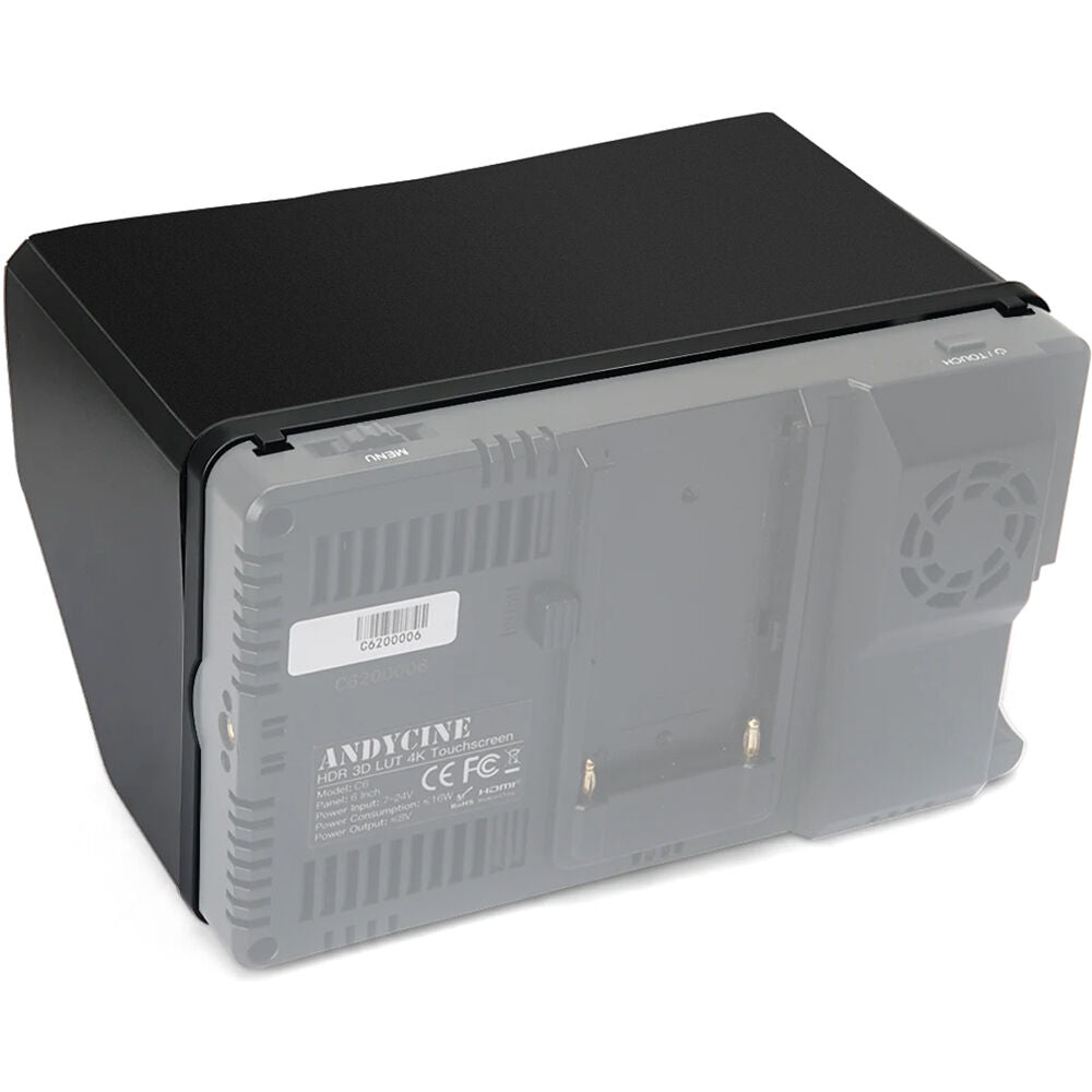 This Sun Hood from ANDYCINE is designed to mount onto an ANDYCINE C6 or C6S monitor to prevent glare and reflection and provide a clear view of the display in bright outdoor conditions. A snap-on frame mounts onto the monitor, and a hook-and-loop strip allows the sun hood to attach and detach easily. The hood portion folds down for storage.