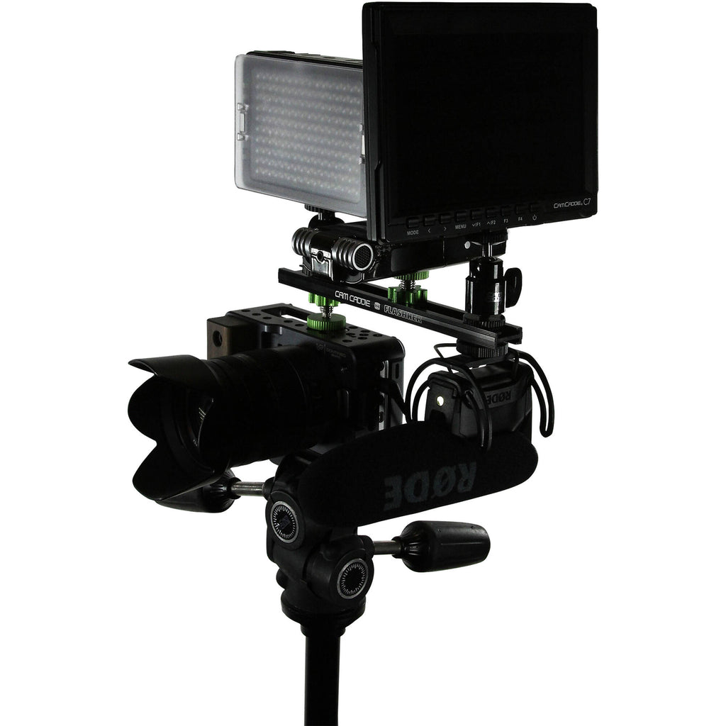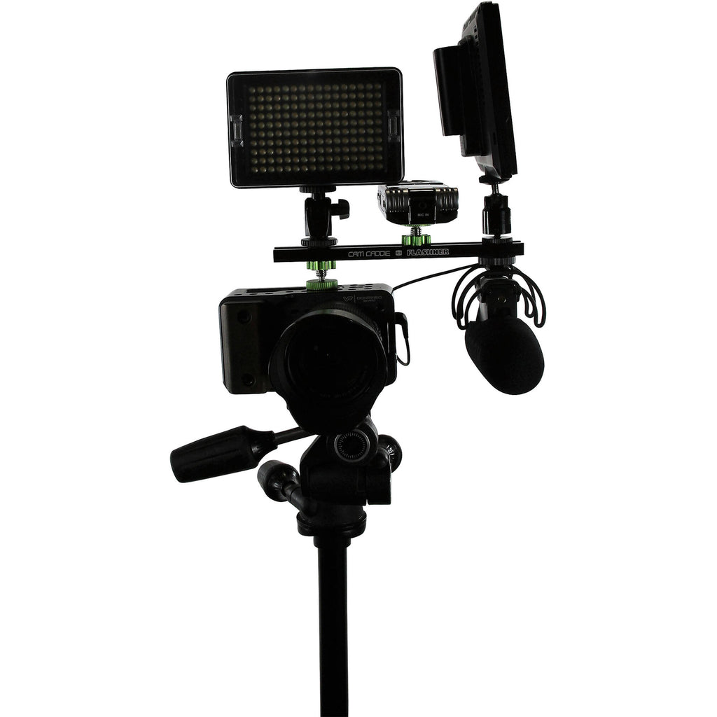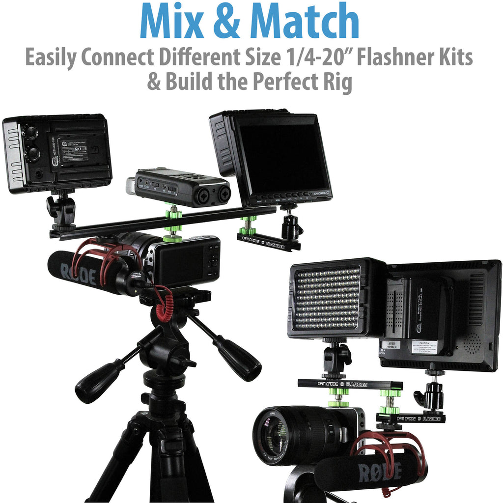 The green 1/4"-20 Flashner Kit - Cold Shoe Extension from CamCaddie allows you to mount a hot or cold shoe flash device to the dual-sided Flashtrak included in every kit. Maximize your camera's capabilities by combining multiple Flashner Kits to create endless mounting options. This 8" accessory is essential for any Blackmagic Design or RED camera user. Seamlessly mount and detach LED lights, field monitors, microphones, field recorders, and lavalier transmitters thanks to the quick release design.