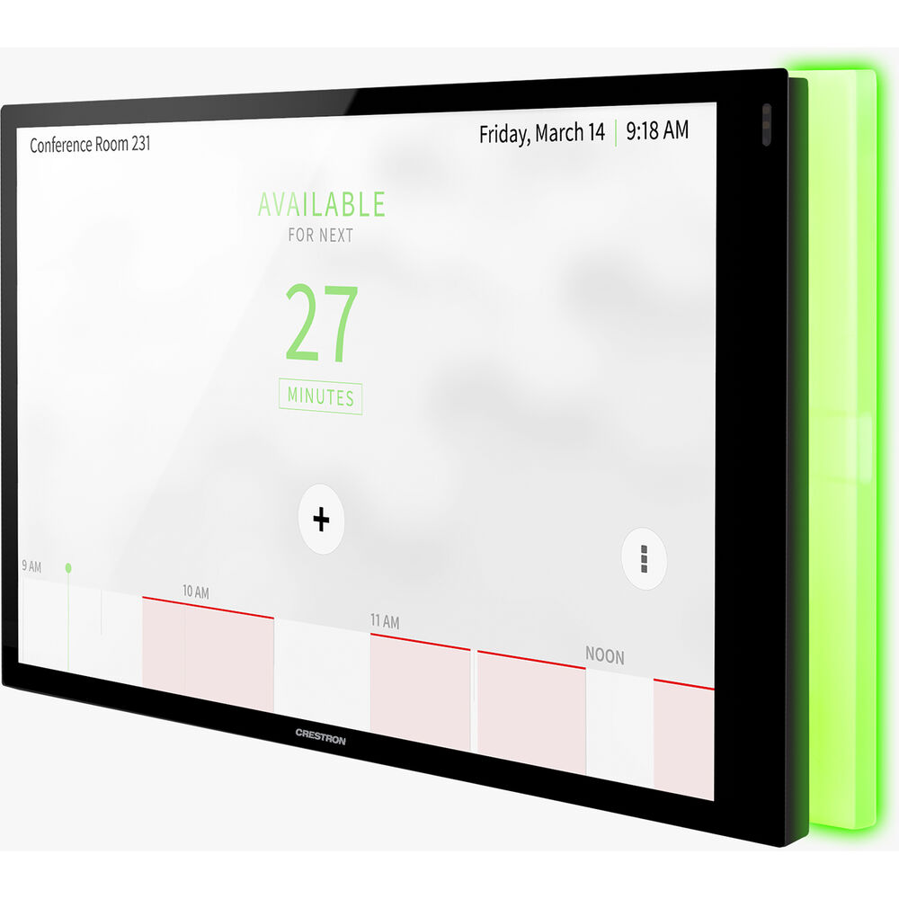 The black Crestron TSW-1070-LB Room Availability Light Bar for TSW-1070 Series touch screens provides a 180° visual indication of a room's availability as part of a complete enterprise room scheduling solution. The TSW-1070-LB mounts easily to the rear of the touch screen and illuminates bright green or red to indicate the room availability status, with options for custom color mixing and programming.