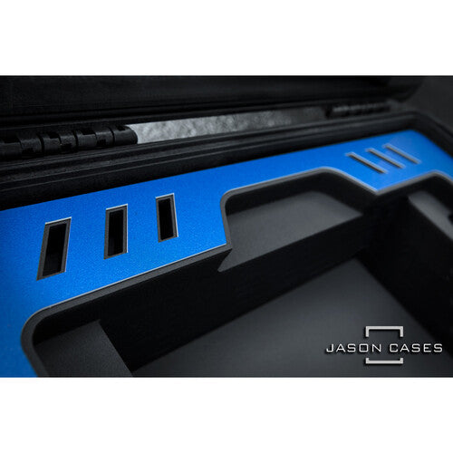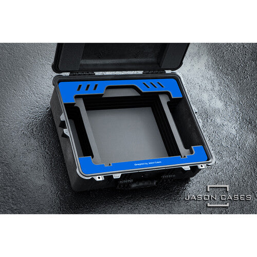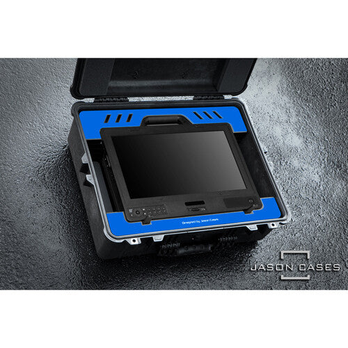 The SmallHD Cine 18" Monitor Case from Jason Cases, with a blue overlay, holds a SmallHD Cine 18" 4K High-Bright monitor, SmallHD monitor feet (attached), a SmallHD monitor handle (attached), a C-stand monitor mount (attached), and cables, as well as an optional acrylic screen protector. This case is made using a genuine Pelican 1600 case with laser-cut, high-grade foam.