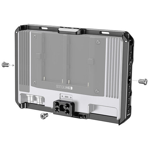 The cage fastens to your monitor via three 1/4"-20 screws and features rubber padding to protect your monitor from scratching. There is a NATO rail on the bottom for quick mounting of compatible accessories, and it also incorporates multiple 1/4"-20 and 3/8"-16 ARRI-style anti-twist accessory threads all around the cage. A three-sided folding sunshade shields your monitor from glare while maintaining access to the control buttons.