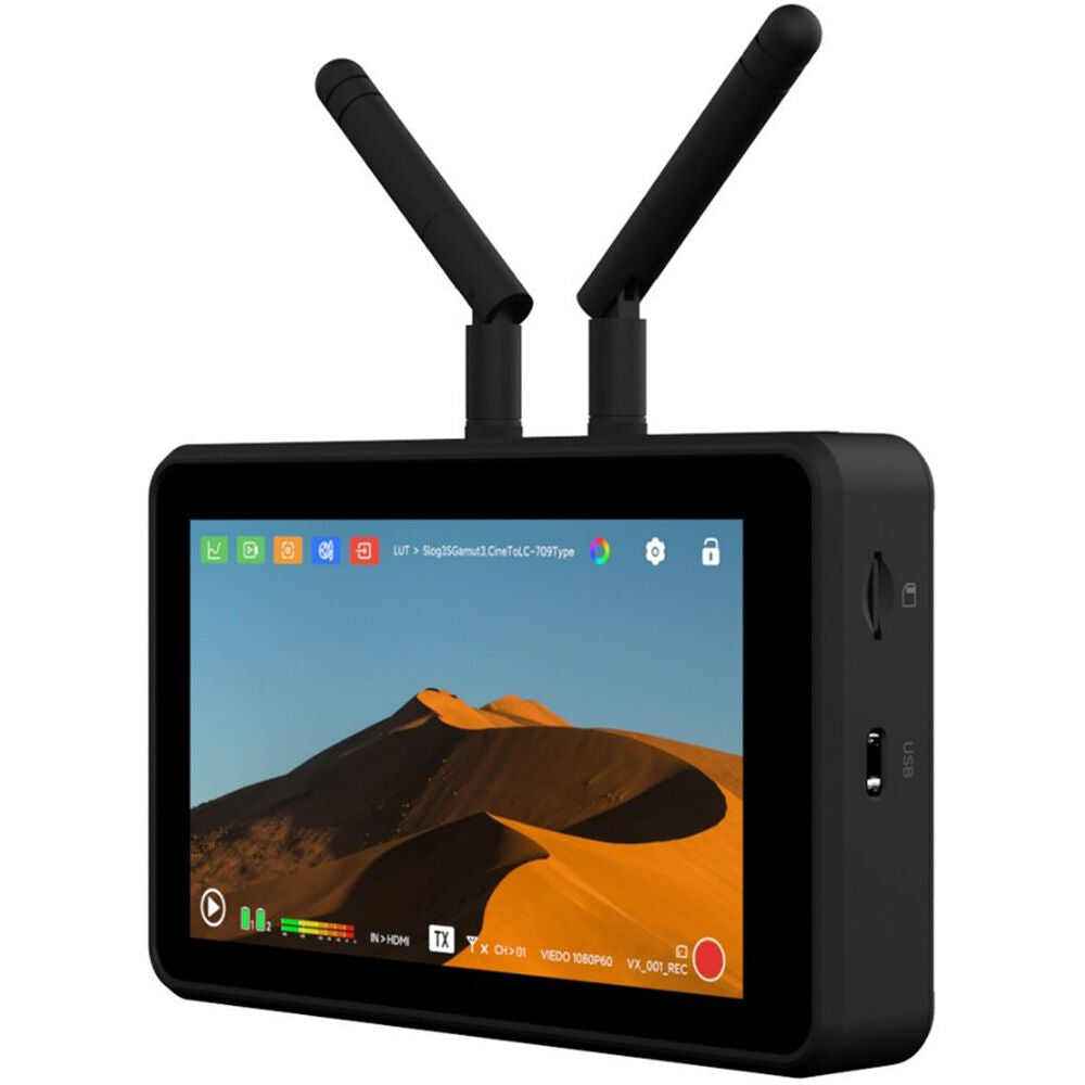 Transmit, receive, monitor, and record high-quality wireless video transmissions using this compact Atom A5 5.5" Wireless RX/TX Monitor from Vaxis. The Atom A5 features a 5.5" touchscreen display that provides a sharp 1920 x 1080 resolution and 1000 cd/m² brightness. Its built-in wireless transmitter and receiver allow you to send and receive video between the Atom wireless transmitter/receiver ecosystem up to 492' away. It has enough sharpness to be a great companion for your wireless follow focus.