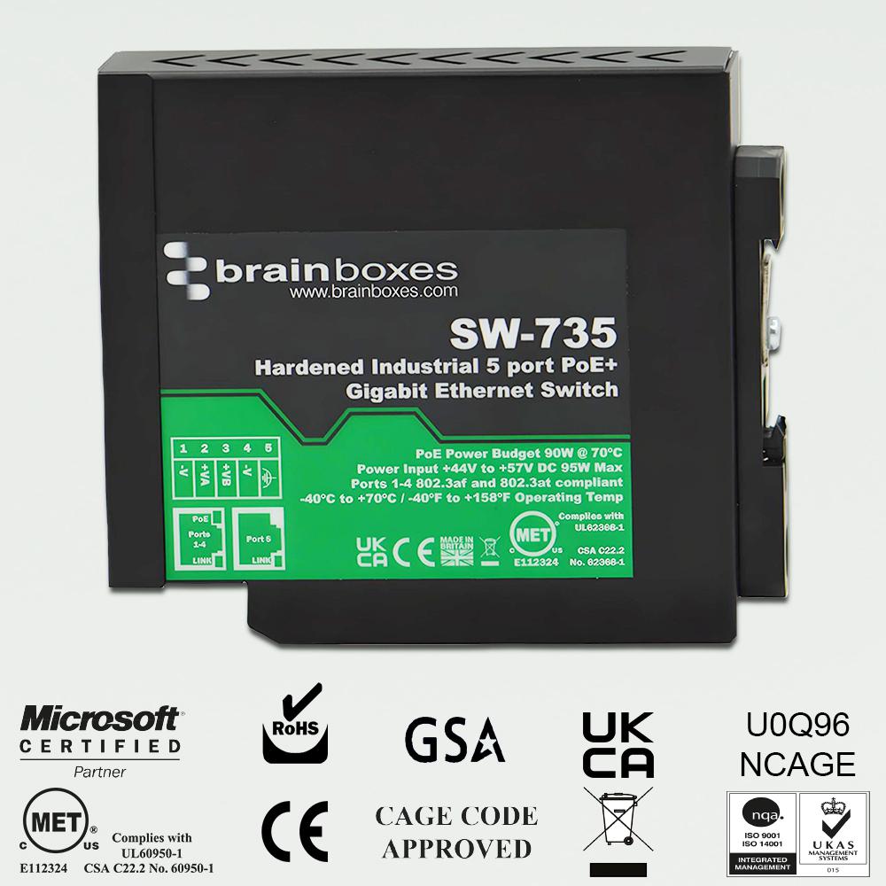 SW-735 is a hardened industrial 5 Port PoE+ gigabit Ethernet switch. Designed for demanding environments, Brainboxes Industrial PoE switch remove the need for costly electrical installations by enabling the transmission of electrical power over the same cable that carries data. Brainboxes PoE switch is simple to install, fully conform to IEEE 802.3af/at Ethernet standards for reliable performance and offer the flexibility to deploy powered devices at almost any location.