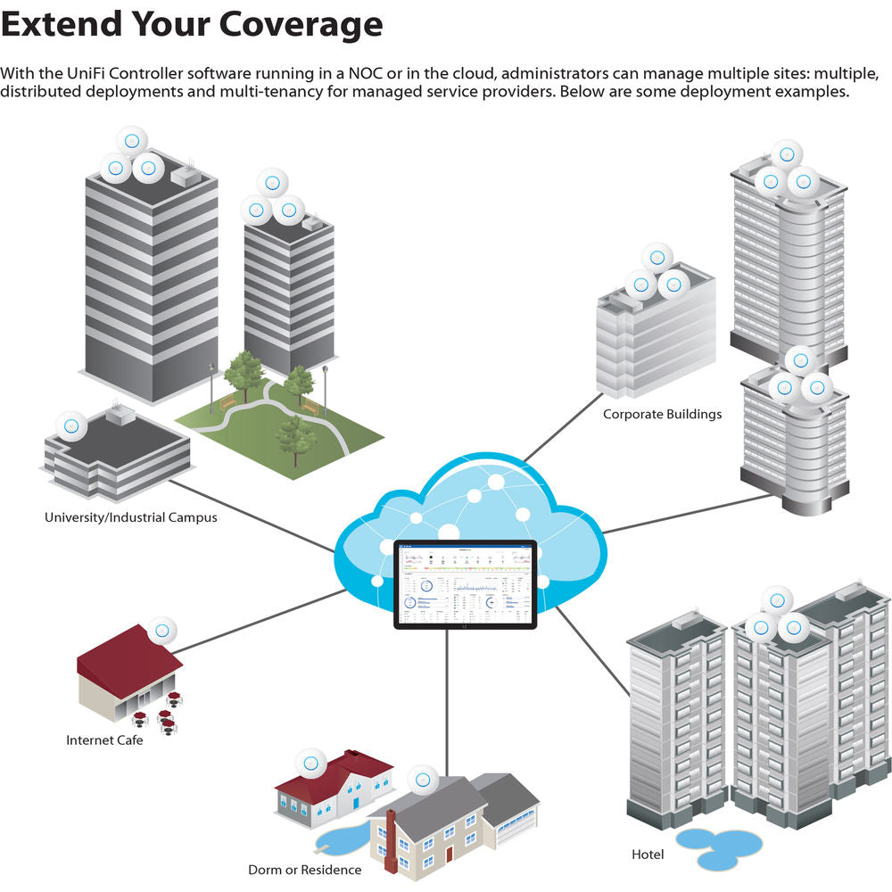 - With the UniFi Controller software running in a NOC or in the cloud, administrators can manage multiple sites: multiple, distributed deployments, and multi-tenancy for managed service providers.