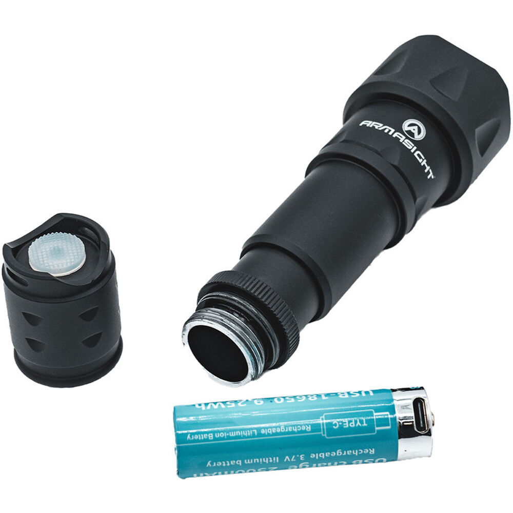 Powered by VCSEL technology, the Armasight Watchman IR Illuminator is a helmet-mountable night vision accessory that identifies and tracks targets beyond 500 yards, making it ideal for tactical, surveillance, and hunting applications. The illuminator features three different brightness settings and adjustable field of view between 3 and 14°. Its durable aluminum construction features a black finish and is IP67-rated for use in the elements. The illuminator also comes with a 30mm ring mount for easy mounting to firearms or night vision devices and an 18650 rechargeable battery. A small red light on the tail cap indicates when the unit is on and helps prevent accidental battery drain.