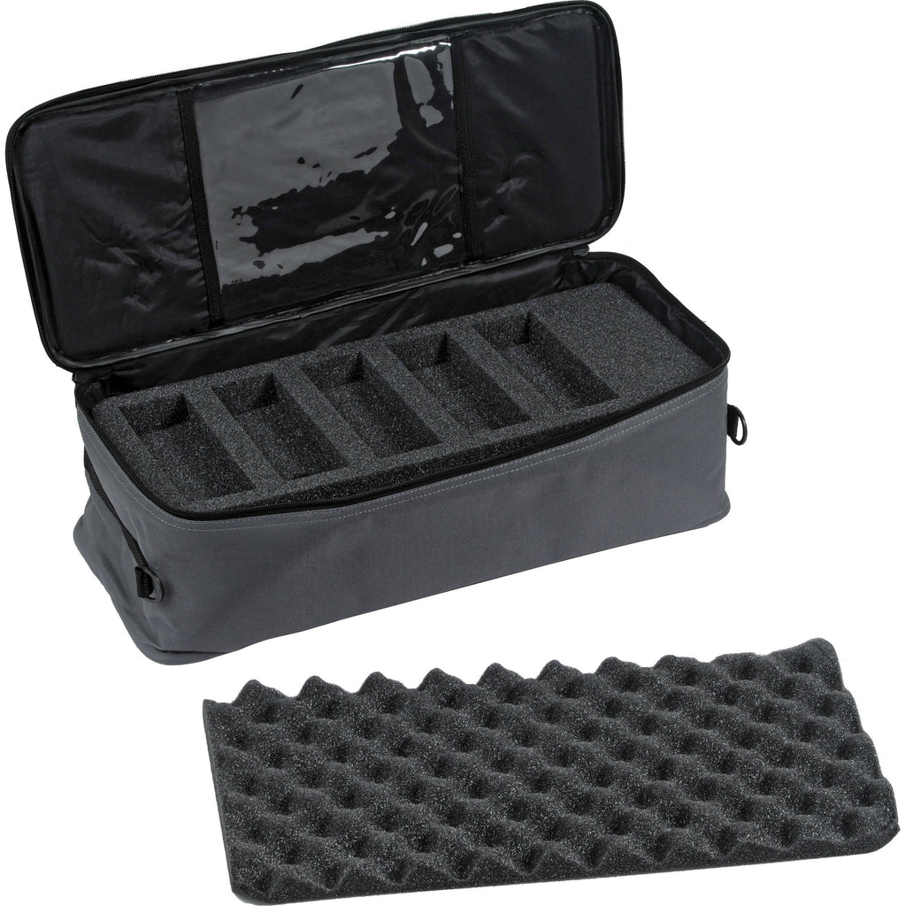 The Eyepiece Bag for Ethos from Tele Vue is a soft, TV-76-sized case with rigid foam for safely carrying the complete Ethos 5-eyepiece collection as well as smaller type eyepieces. There are 3 dual-size holes for carrying other types of optical accessories as well. The dense foam protects the eyepieces from shock, bumps and bruises. The foam also holds the case rigid; it will not flex even when loaded. The external bag is an attractive medium gray nylon material. A carry handle and adjustable shoulder strap are included.