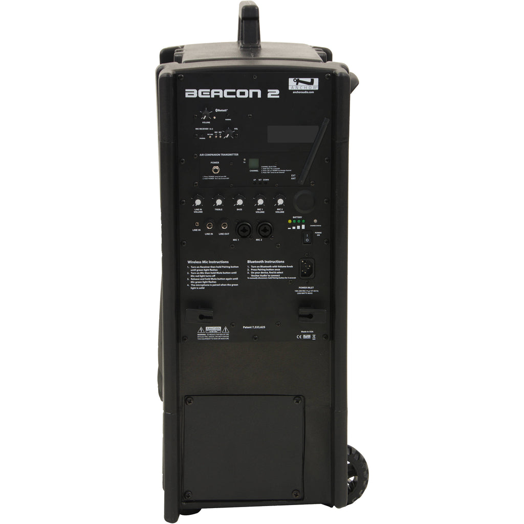 The supplied AIR wireless transmitter enables cord-free connection to a compatible companion speaker. Power the Beacon 2 via AC power or the built-in rechargeable lithium-ion batteries, which offer approximately six to eight hours of operating time on a single charge. The integrated carry handle and heavy-duty rolling wheels simply transport of the system.