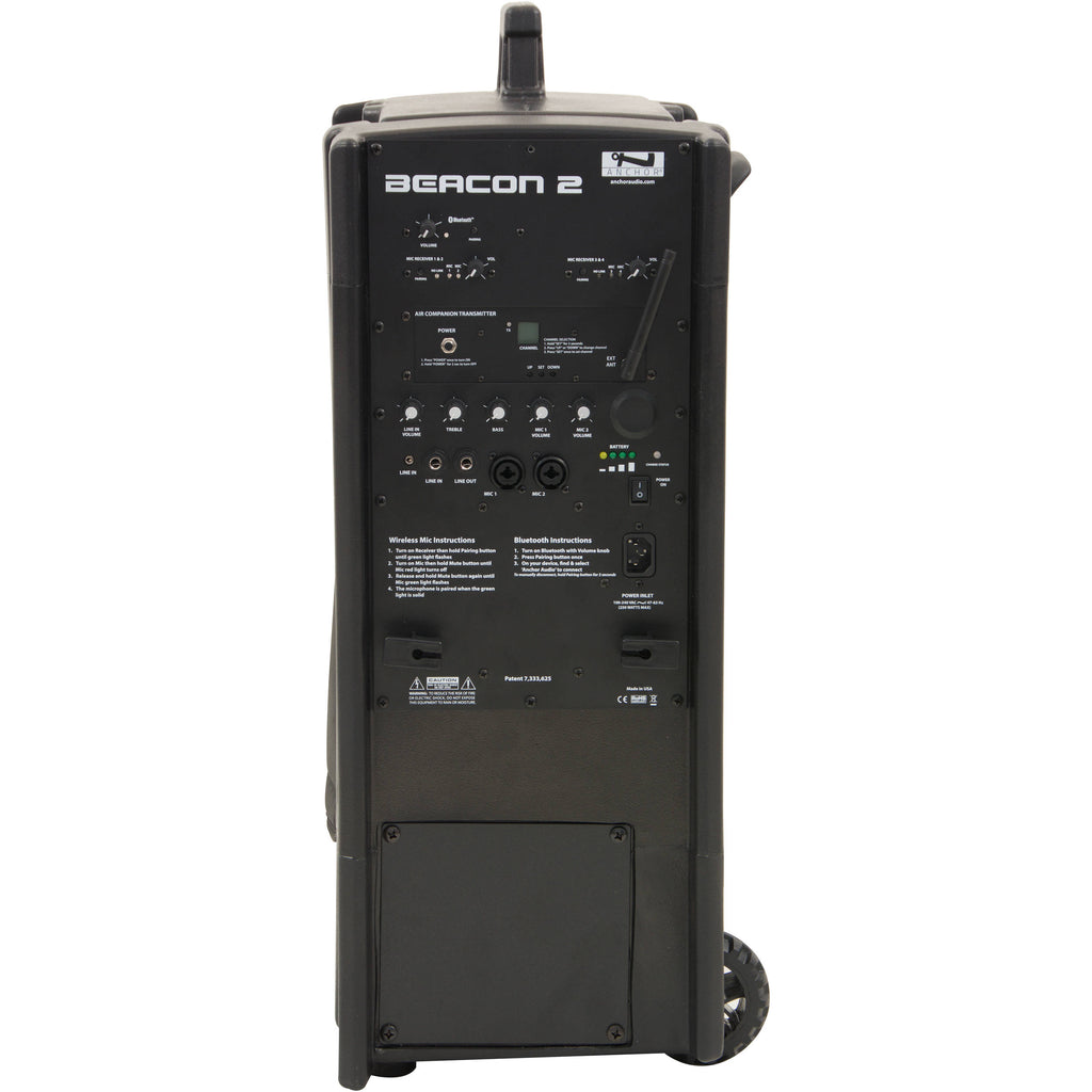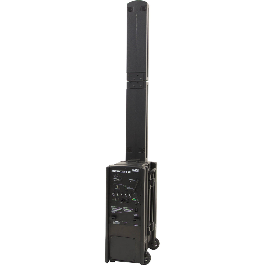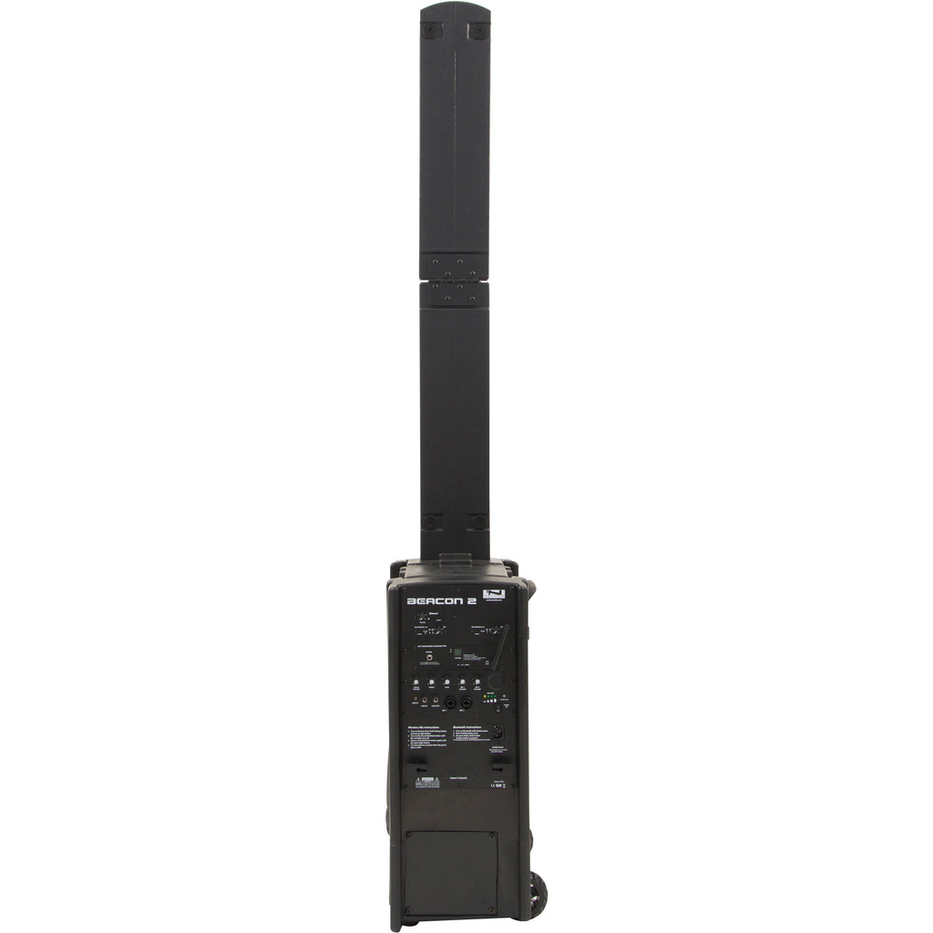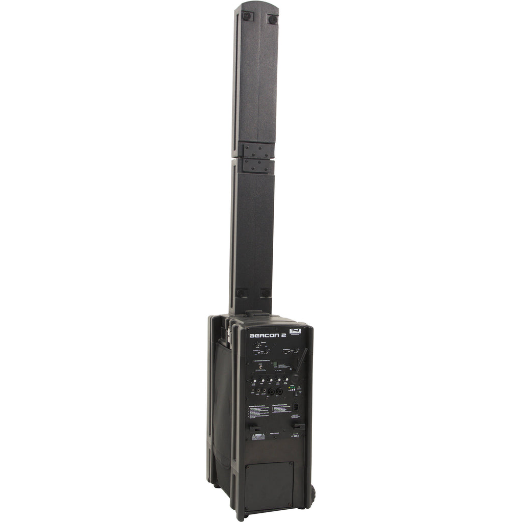 The supplied AIR wireless transmitter enables cord-free connection to a compatible companion speaker. Power the Beacon 2 via AC power or the built-in rechargeable lithium-ion batteries, which offer approximately six to eight hours of operating time on a single charge. The integrated carry handle and heavy-duty rolling wheels simply transport of the system.
