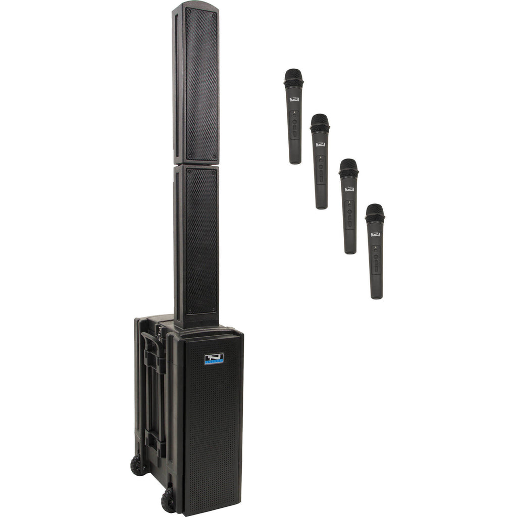 The Beacon System 4 includes the battery-powered Beacon 2 portable line array tower, two dual wireless microphone receivers, and four handheld wireless microphones.