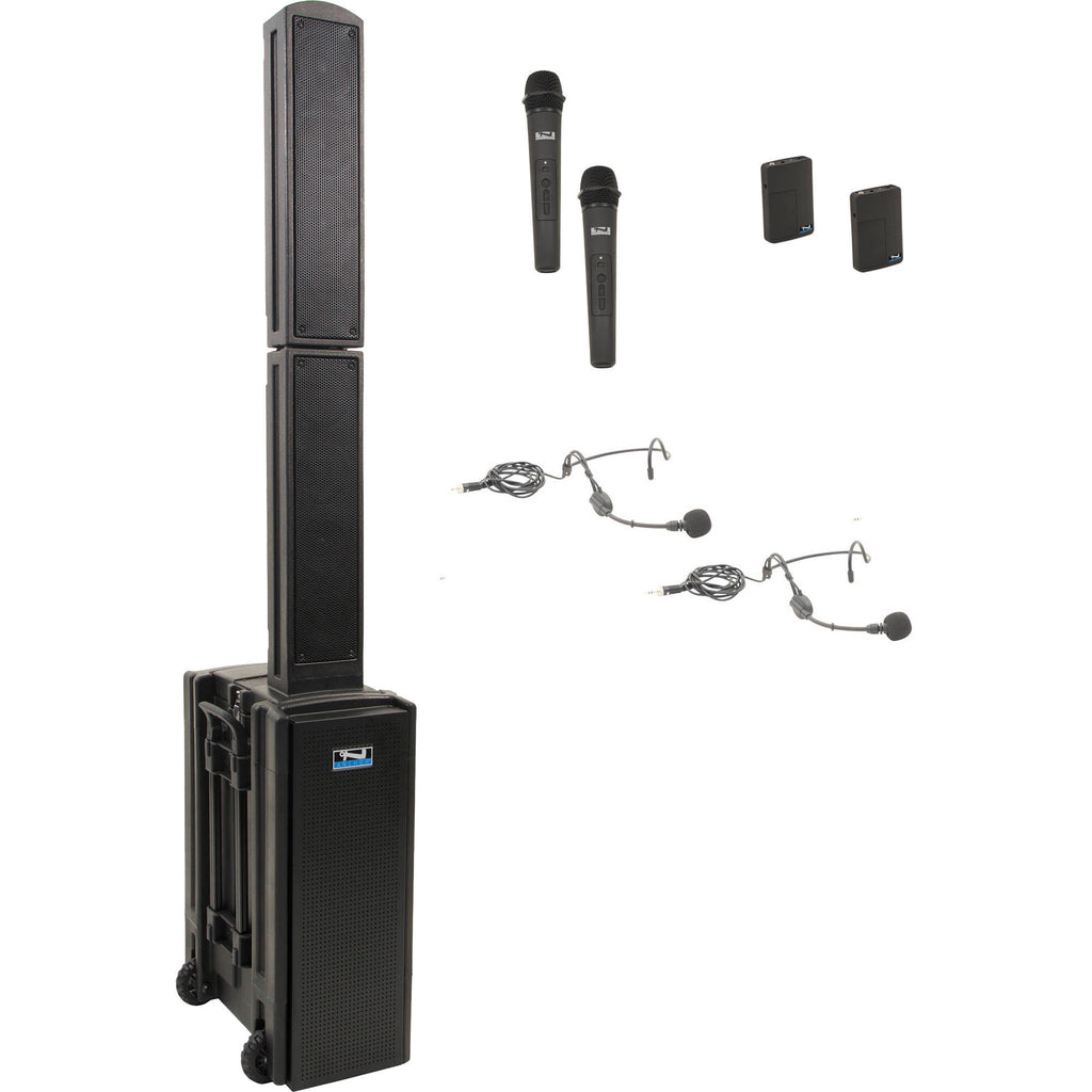 The Beacon System 4 includes the battery-powered Beacon 2 portable line array tower, two dual wireless microphone receivers, two handheld wireless microphones, two beltpack transmitters, and two headset microphones.