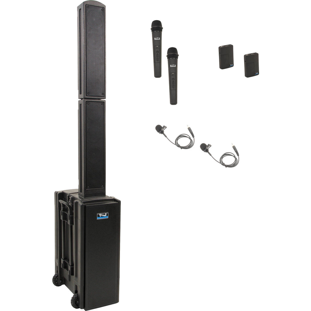 The Beacon System 4 includes the battery-powered Beacon 2 portable line array tower, two dual wireless microphone receivers, two handheld wireless microphones, two beltpack transmitters, and two lavalier microphones.