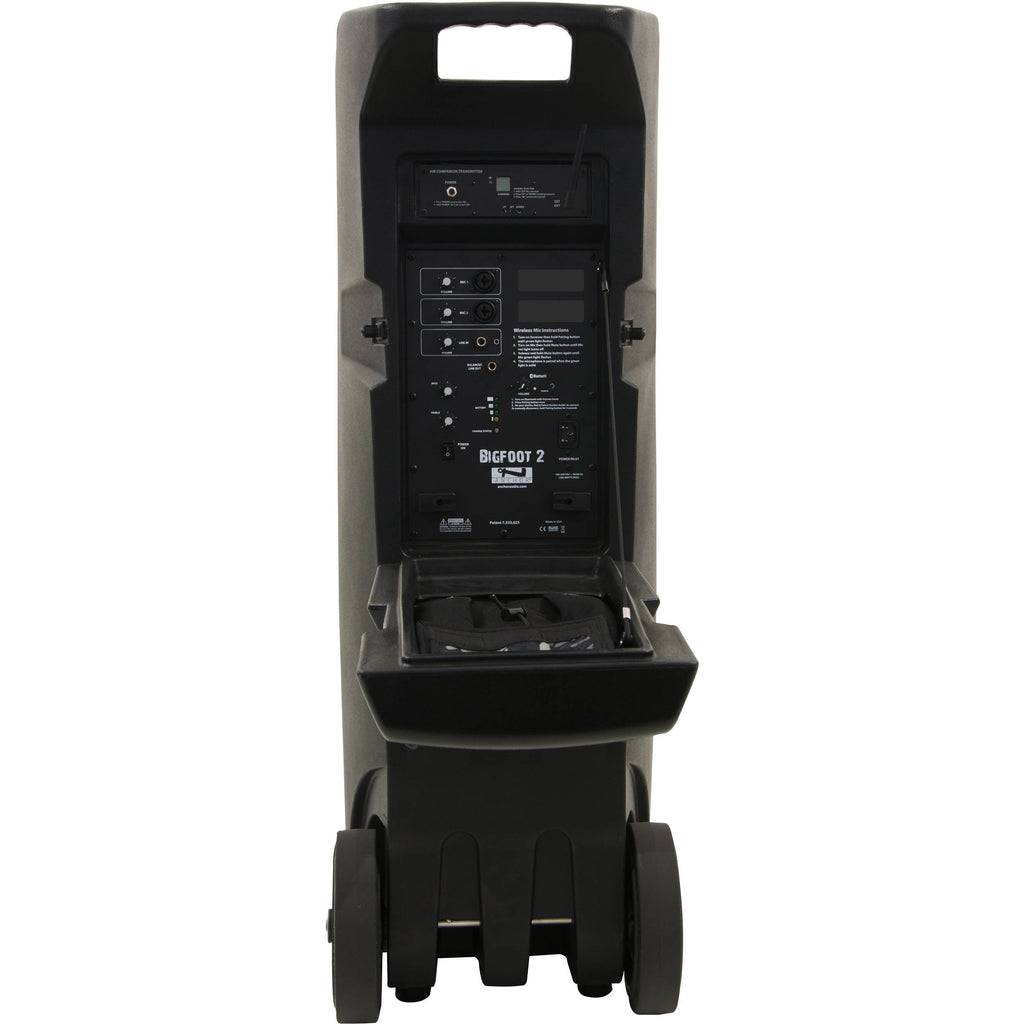 The supplied AIR wireless transmitter enables cord-free connection to a compatible companion speaker. Power the Bigfoot 2 via AC power or the built-in rechargeable lithium-ion batteries, which offer approximately six to eight hours of operating time on a single charge. The integrated carry handle and heavy-duty rolling wheels simplify transport of the system.