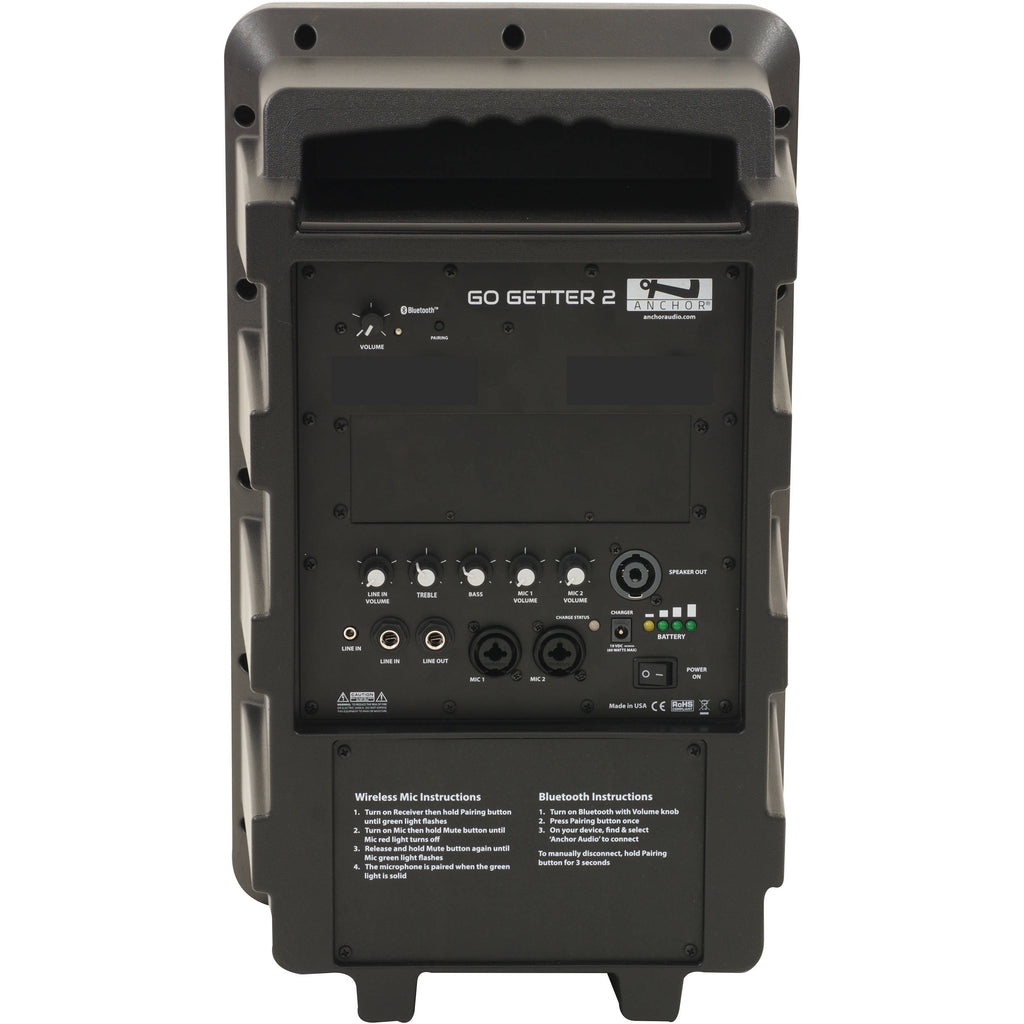The Anchor Audio GG2 Go Getter Portable Sound System delivers 109 dB of clear sound and features easy-to-use controls. It is suitable for both voice and background music, and at 15 lb, is portable and easy to set up on an optional speaker stand (not included). The GG2 Go Getter sound system can be used indoors or outdoors and features AC/DC operation.