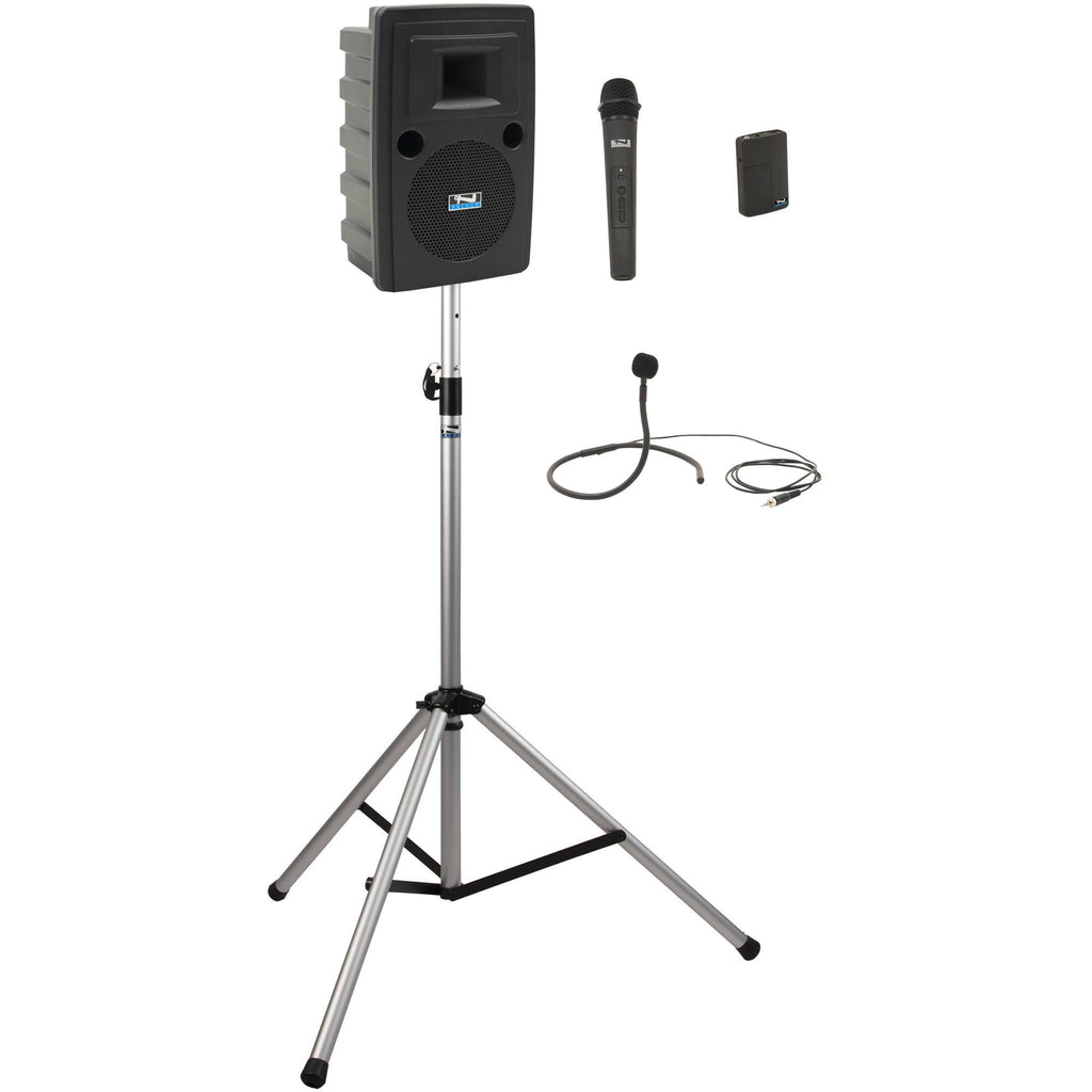 The Liberty System 2 includes the battery-powered Liberty 2 PA system, a wireless handheld microphone, a beltpack transmitter, a collar microphone, and a heavy-duty speaker stand.