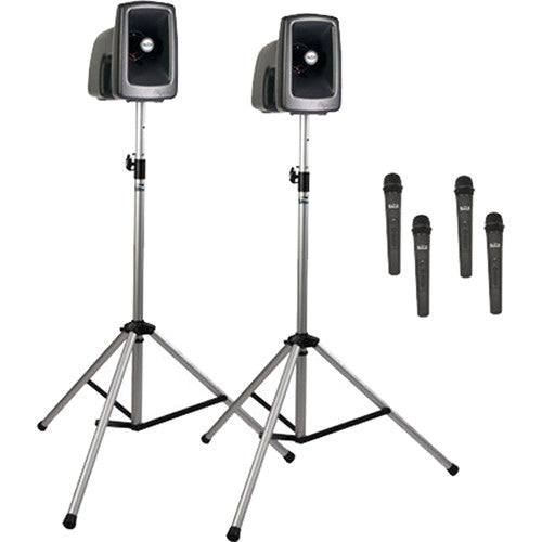 The Anchor Audio MEGA-DP4-AIR-HHHH is a MegaVox 2 deluxe AIR package consisting of a MEGA2-XU4 MegaVox 2 portable PA system, a MEGA2-AIR wireless companion speaker, two SS-550 speaker stands, and four WH-LINK wireless handheld microphones. It offers simple setup and a high maximum SPL for broad crowd coverage in a variety of indoor and outdoor events where voice amplification is a priority. The WH-LINK microphones wirelessly transmit over the 1.9 GHz frequency band to the two dual wireless microphone receivers in the MEGA2-XU4, which is easily placed atop the included speaker stand. The MEGA2-XU4's built-in rechargeable battery enables hours of reliable operation even when there are no power outlets to be found.