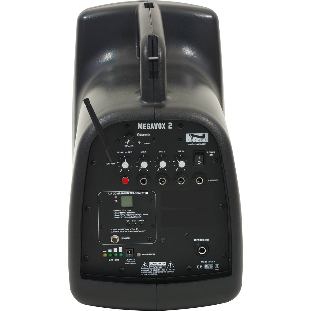 The Anchor Audio MEGA2-X is a MegaVox 2 portable PA system with Bluetooth and an AIR wireless transmitter. With 20W of rated output power driving a high-efficiency, re-entrant horn driver to produce 119 dB SPL, it is designed to deliver powerful amplification in a compact housing for crowds of up to 1000 people in sports venues, public gatherings, and various outdoor events.