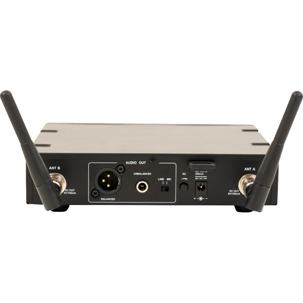 Rear Panel | Antennae: 2 x BNC Balanced Output: XLR Unbalanced Output: 1/4" / 6.35 mm Mic/Line Switch: Adjusts Audio Level for Mic (-20 dB) or Line (0 dB) Squelch Knob: Adjust or Decrease Noise Floor Level Power Adapter: 12 VDC (Center-Pin Positive) |