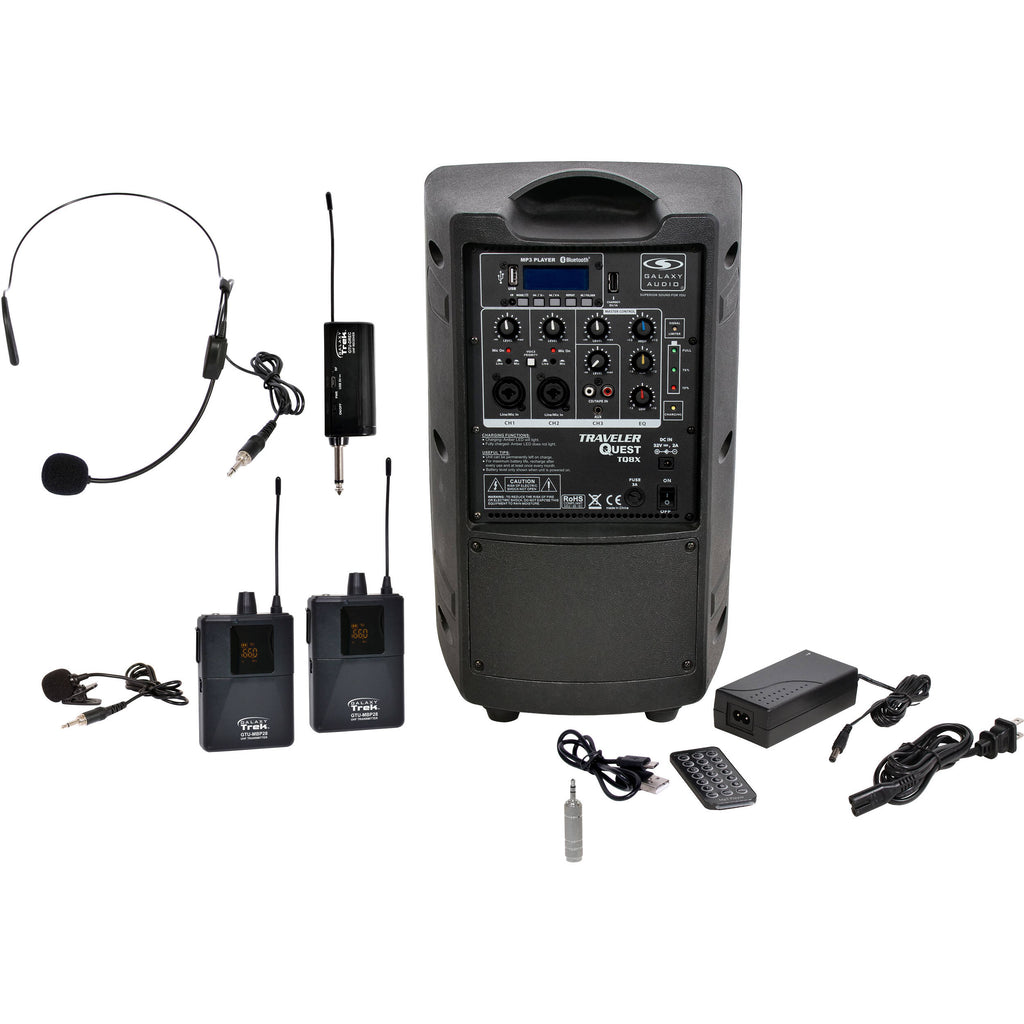 Looking for a portable, battery-powered PA with a wireless lavalier microphone and a wireless headset microphone? Check out the Galaxy Audio Traveler Quest TQ8X PA with GAGTUVSP5AB Wireless Mic System, an all-in-one PA with an easy-to-use wireless system that allows performers and presenters to move about freely without constraint.