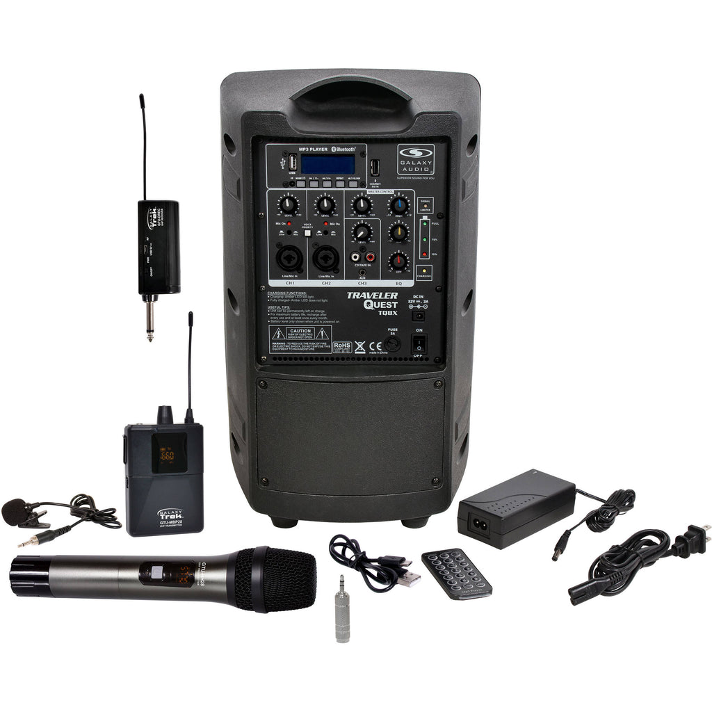 Looking for a portable, battery-powered PA with a handheld wireless microphone and a wireless bodypack transmitter with lavalier microphone? Check out the Galaxy Audio Traveler Quest TQ8X PA with GTU-VHP5AB Wireless Mic System, an all-in-one PA with an easy-to-use wireless system that allows performers and presenters to move about freely without constraint.