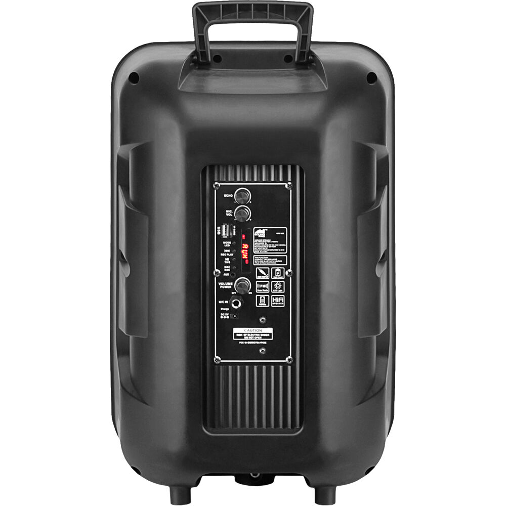 The rear panel offers a 1/4" microphone input. The onboard media player accepts flash drives (up to 120 GB) and TF cards (up to 32 GB). Additionally, the speaker offers an FM radio, a 3.5mm aux input, and a Bluetooth receiver with a 30' range. The speaker is also True Wireless Stereo (TWS), which allows two speakers to connect to a single device for wireless stereo operation. There are three rotary controls for mic volume, echo, and master volume. In addition to the power switch, the unit also provides an On/Off switch for the LED lights.