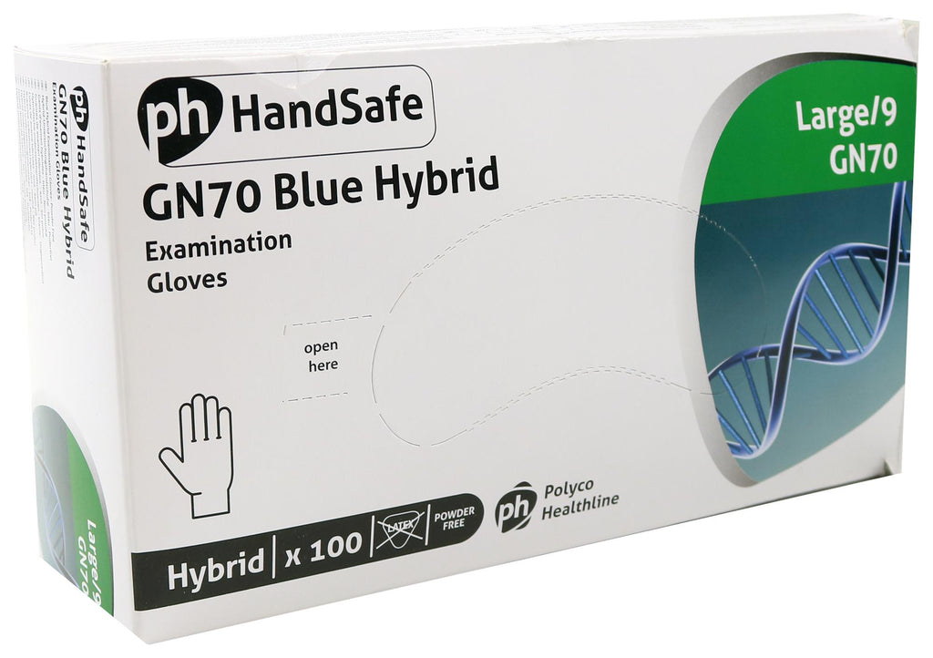 Blue hybrid powder-free examination gloves with a smooth finish, made from a blend of polyvinyl chloride and acrylonitrile butadiene. Latex free, reducing the risk of hypersensitivity and allergic reactions. Flexible material for improved feel and fit reducing fatigue during extended wear. Tested in accordance with European standard EN1186 making it suitable for food contact. Powder-free, reducing the risk of dust contamination. Suitable for use in automotive, engineering and manufacturing, food manufacturing and preparation, janitorial, medical, vet and dental sectors.