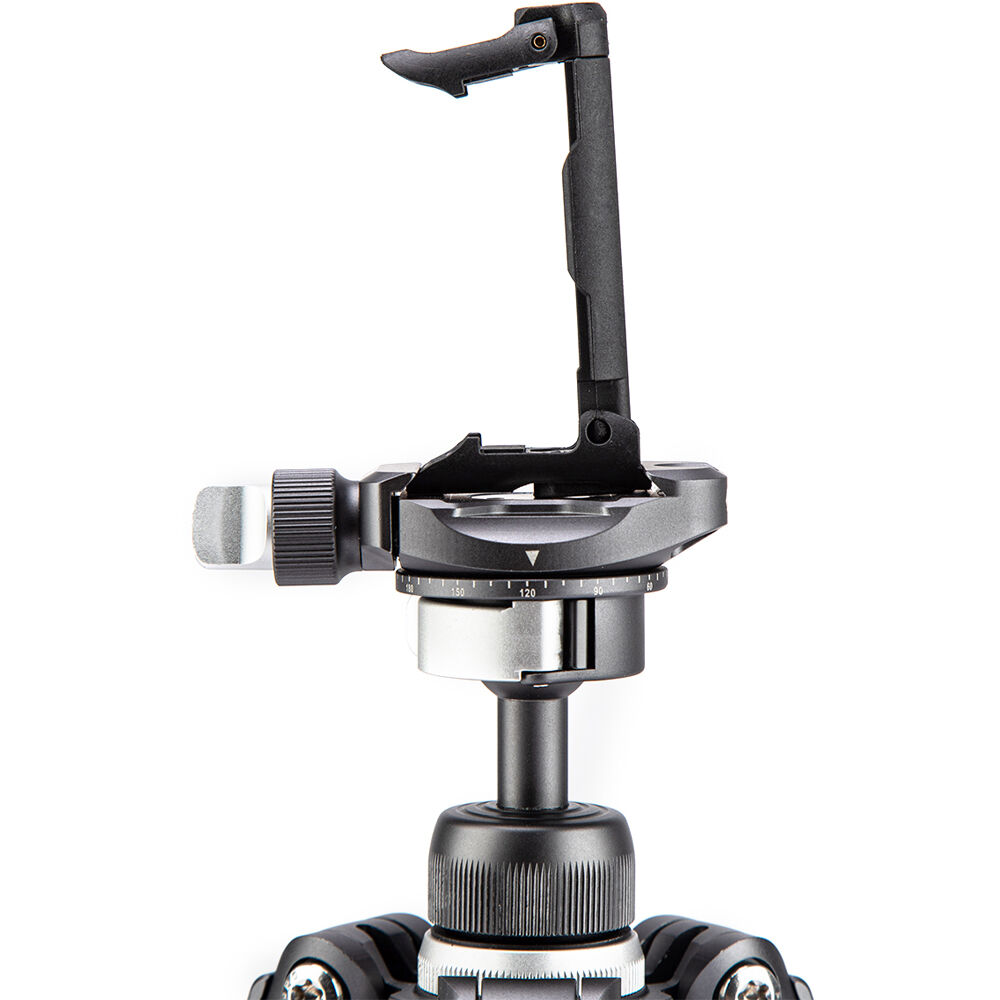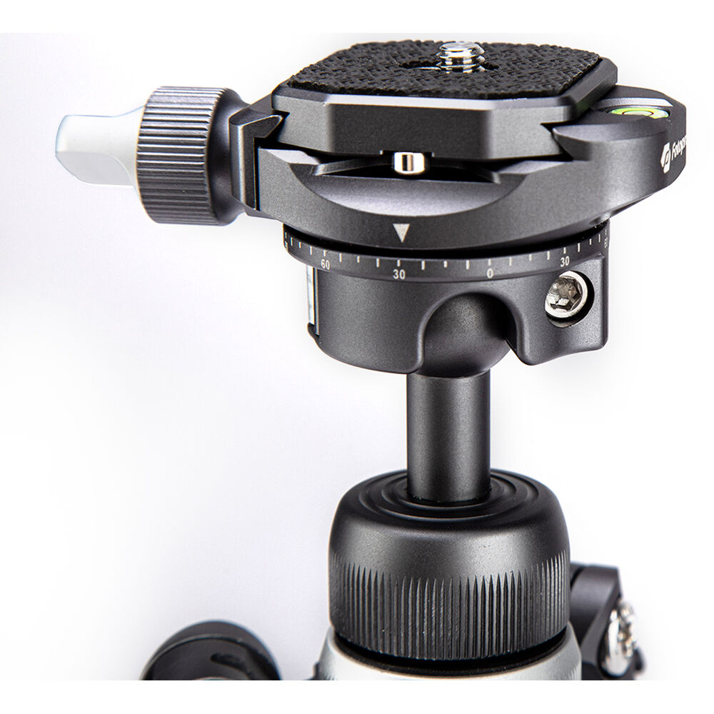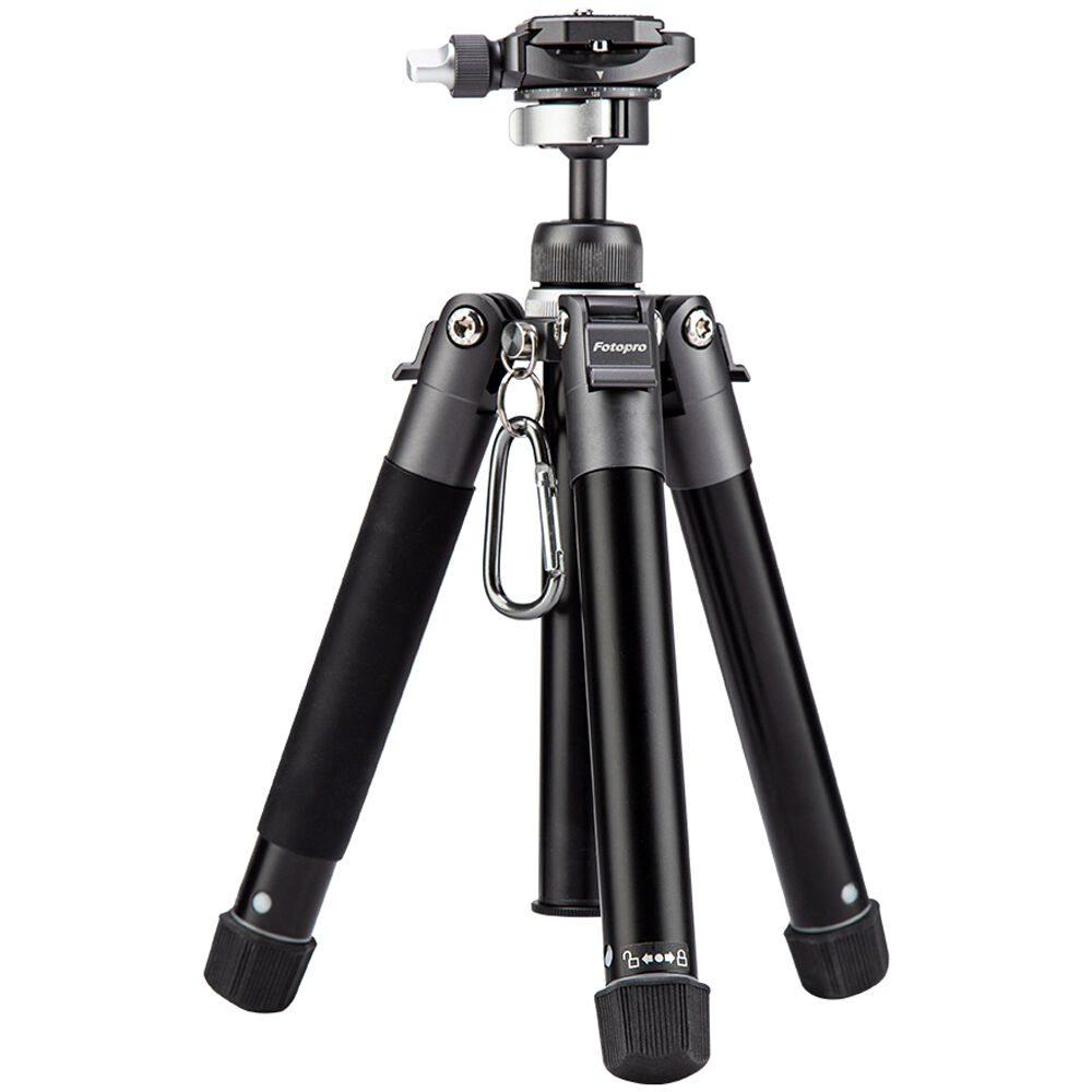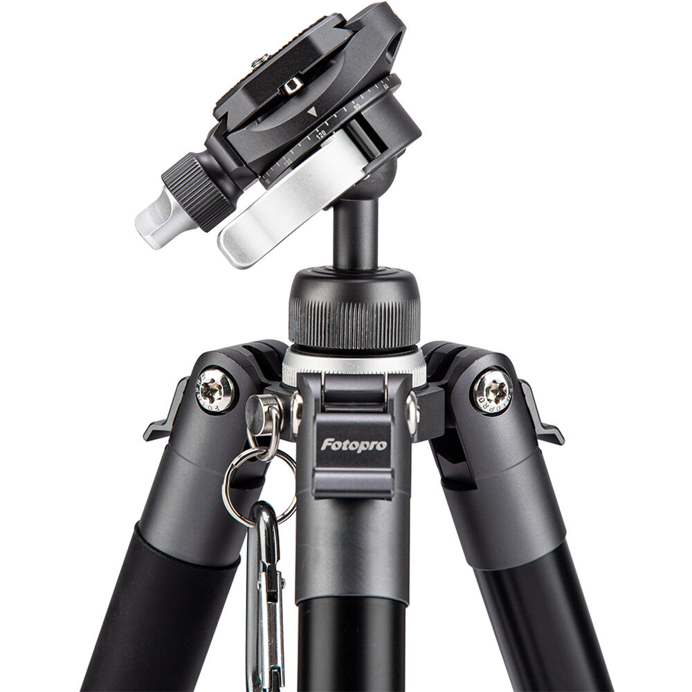 The slate gray FY-820 Free-1 Compact Aluminum Travel Tripod from Fotopro is a compact travel tripod with a number of useful features. It has a load capacity of 8.8 pounds and expands to a maximum height of 60", yet it weighs only 1.8 pounds, and folds down to a compact 9.8", making it easy to carry to any location. The ball head has an Arca-type quick release set, and includes a smartphone adapter for shooting online content, and even making TokTok videos. The included carabiner allows hanging extra weight to the Free-1 tripod for increased stability.
