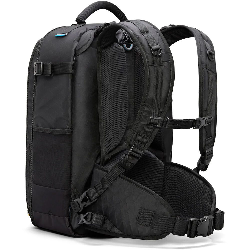 Carry options include a built-in top handle, a side handle, and padded, adjustable shoulder straps. The resilient and breathable 3D mesh padding along the rear exterior cushions your back and shoulders. The padding features an elevated structure to optimize air circulation, minimizing perspiration in warm and hot environments. For heavy loads, use the adjustable sternum strap and waist belt to evenly distribute the weight. The pack features a compartment for a 16" laptop and large, stretch side pockets with compression straps to hold a water bottle, a tripod, a monopod, or a trekking pole.