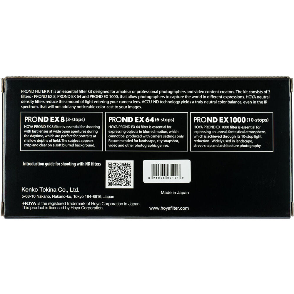 The 77mm ProND EX 3-Filter Kit from Hoya includes three ND filters, all featuring front and rear 77mm threading, so they can be stacked together. The ND8 filter reduces the amount of light passing through the lens by 3 stops, the ND64 by 6 stops, and the ND1000 by 10 stops. These filters feature Hoya's ACCU-ND technology, which prevents color shift to allow consistent image quality. The filters are made of glass and the filter rings are aluminum. A carry pouch is included that holds all three filters.