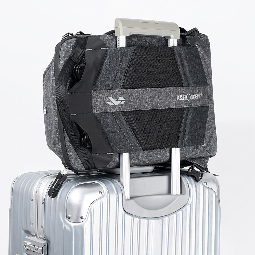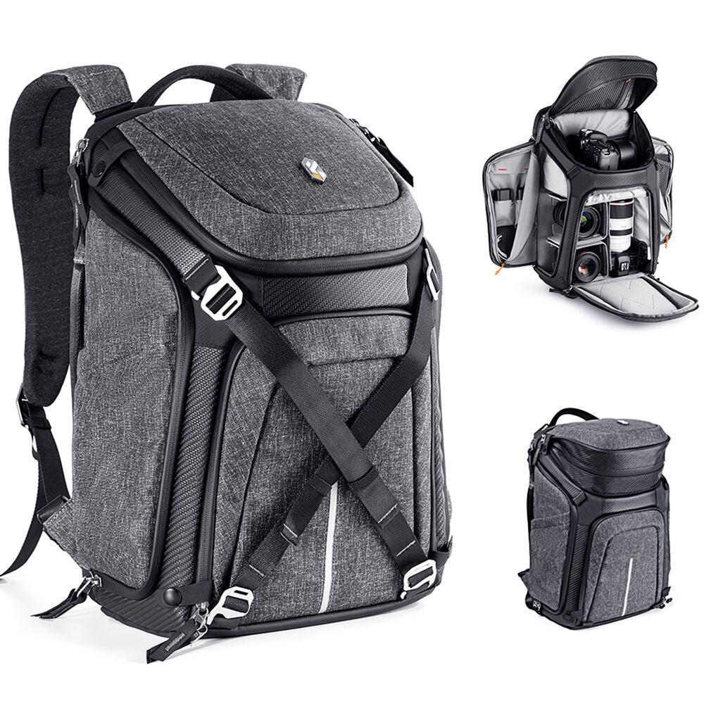 The gray K&F Concept Alpha Backpack holds two cameras, four Lenses, a 15.6" laptop, a 10.5" tablet, a tripod, and other essentials. The suspended top compartment accommodates travel necessities including clothes, a towel, and other personal items. The Alpha Backpack is designed for professional photographers and enthusiasts alike, with a high degree of freedom and detail to meet different loading and protection needs. It can be used to take professional video equipment with a full range of focal lengths on a road trip. Whether it's a professional shoot or a commuter holiday, the Alpha backpack is well suited for a diverse range of uses and changing environments.