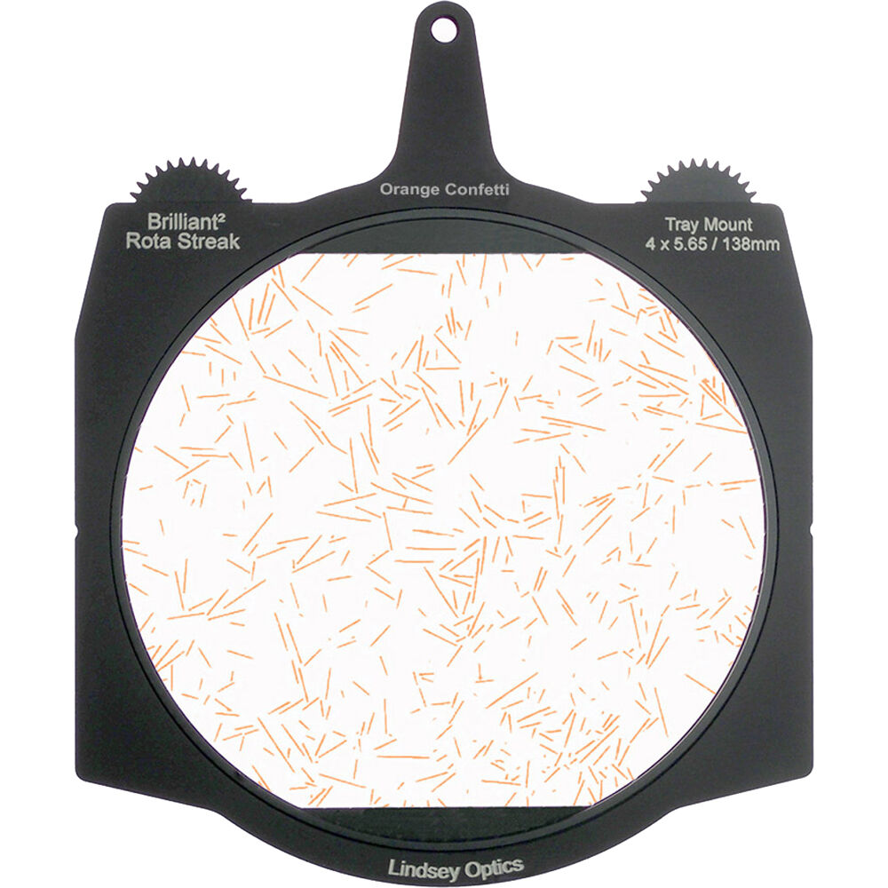 This Brilliant² Rota-Streak from Lindsey Optics is a 138mm glass filter in a frame made to fit standard 4 x 5.65" matte boxes. The filter has embedded orange rods in a random pattern to create the confetti streak effect. The filter allows you to create an in-camera streak effect on bright lights and highlights in the shot. The filter frame features two gears, one on each side of the tray for flexibility in rotating the filter from either side of the lens, and you can rotate the filter either manually or by using a motor to position the filter effect in any desired position.
