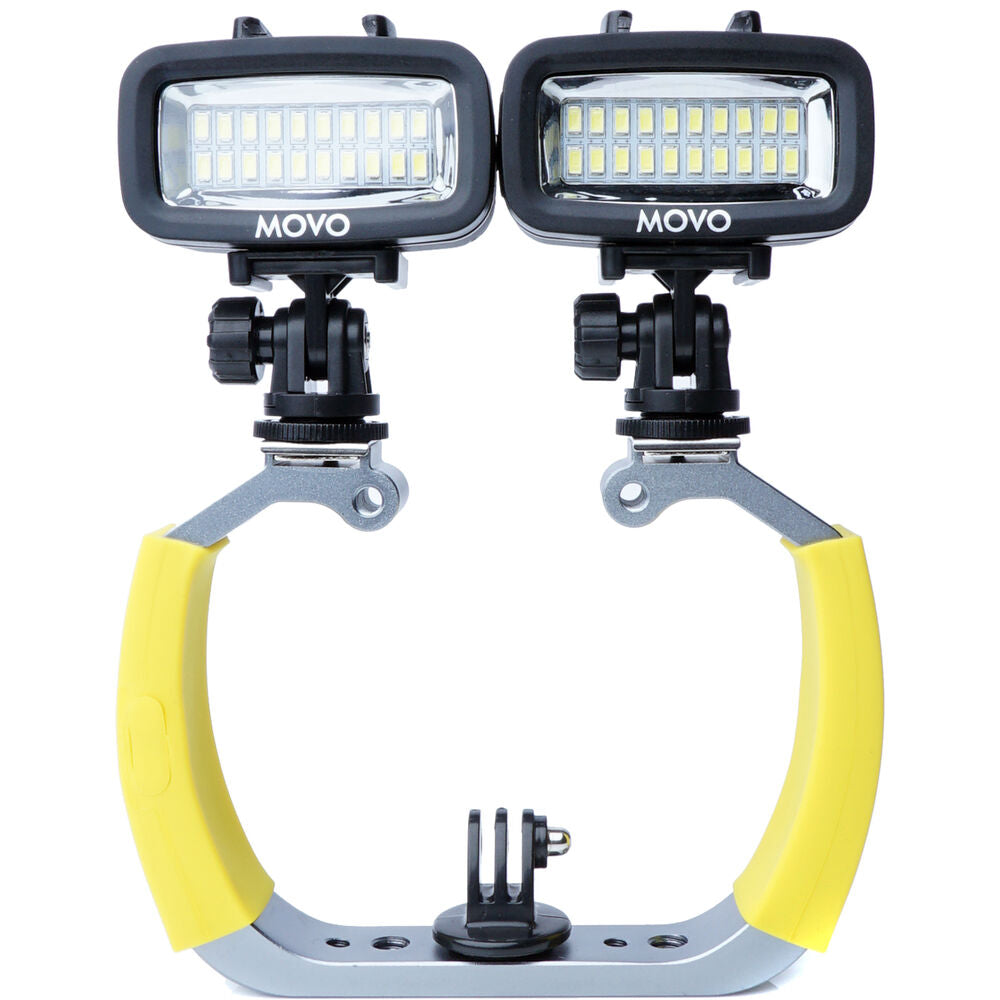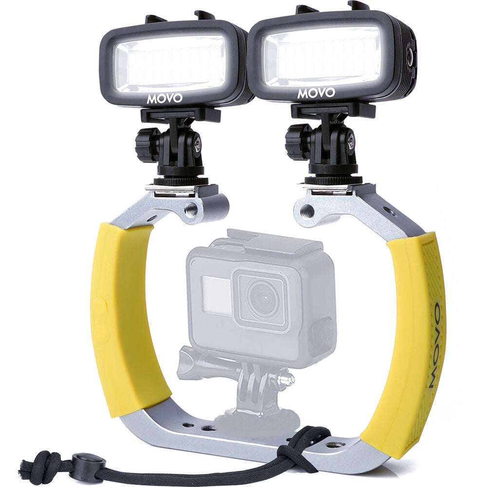 Capture stunning underwater photos and video on your GoPro Hero series camera with this Underwater Diving Rig Bundle with 2 Rechargeable LED Lights for GoPro from Movo Photo. The bundle includes an aluminum tray with two handles, a center action camera mount, and two rechargeable, 700-lumen waterproof LED lights.