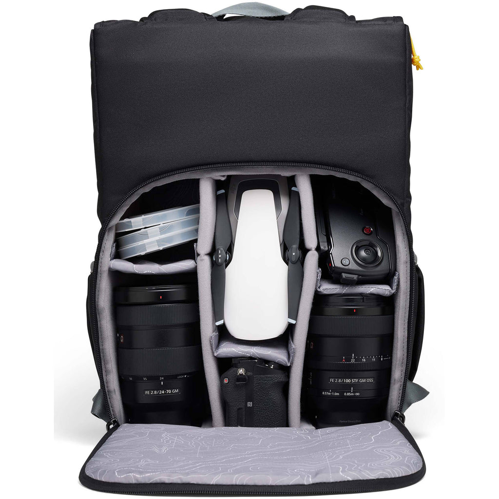 This black National Geographic Camera Backpack is comfortable to carry and has an ultralight, practical design. It will protect your DSLR or mirrorless camera plus four additional lenses during storage and transport. Or you can use it for carrying a foldable drone with controller, charger, and accessories. Sprung side pockets carry your water bottle or a small tripod.