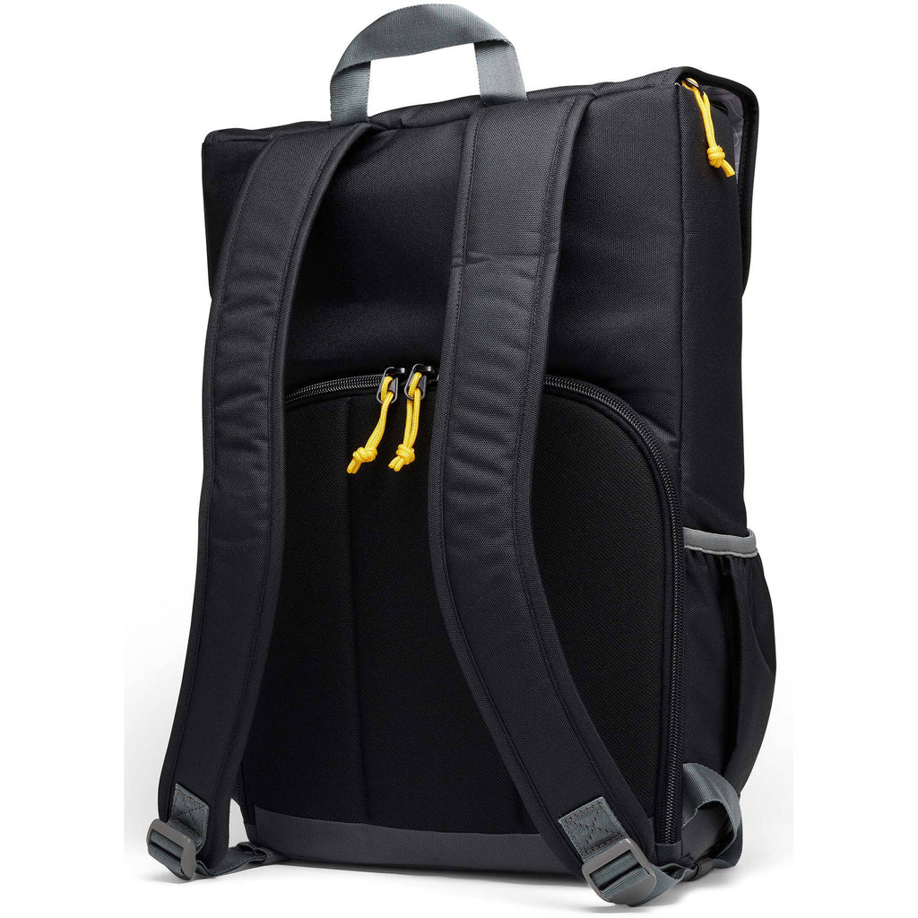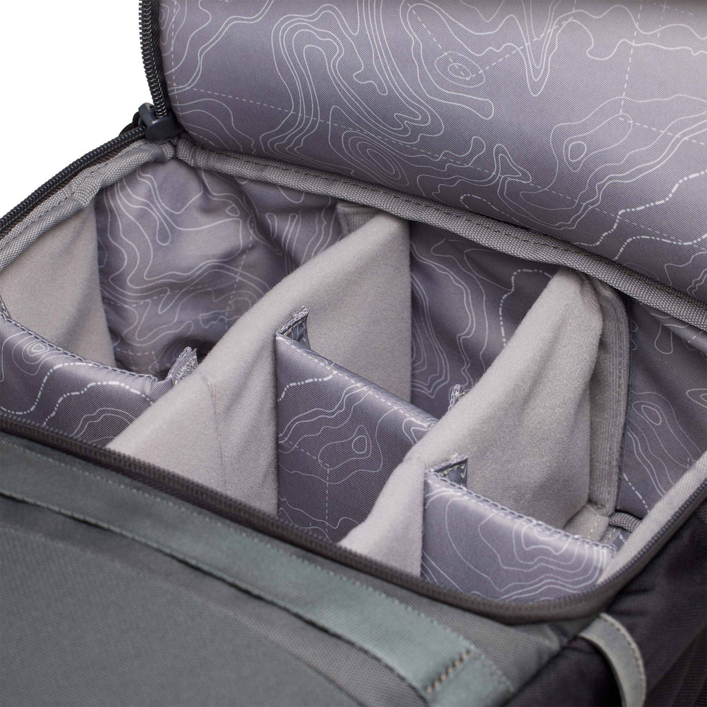 The interior has two compartments, one with adjustable foam dividers and rear only access for your camera gear. The other section of the backpack is a top compartment for holding your personal items. There is also an integrated sleeve for your laptop. The rear access offers added security and allows you to lay the pack down to see and access your gear. The adjustable backpack straps and a top grab handle provide easy carrying options.