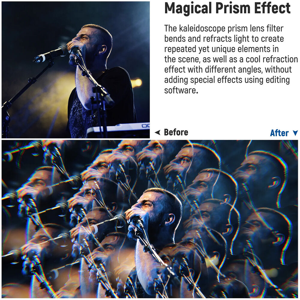 Compatible with lenses with 67mm filter threads, the Kaleidoscope Prism Lens Filter from Neewer bends and refracts light to create kaleidoscope-like images. Use this filter to get repeated yet unique elements for your scenes, as well as a refraction effect that makes your photography more creative.