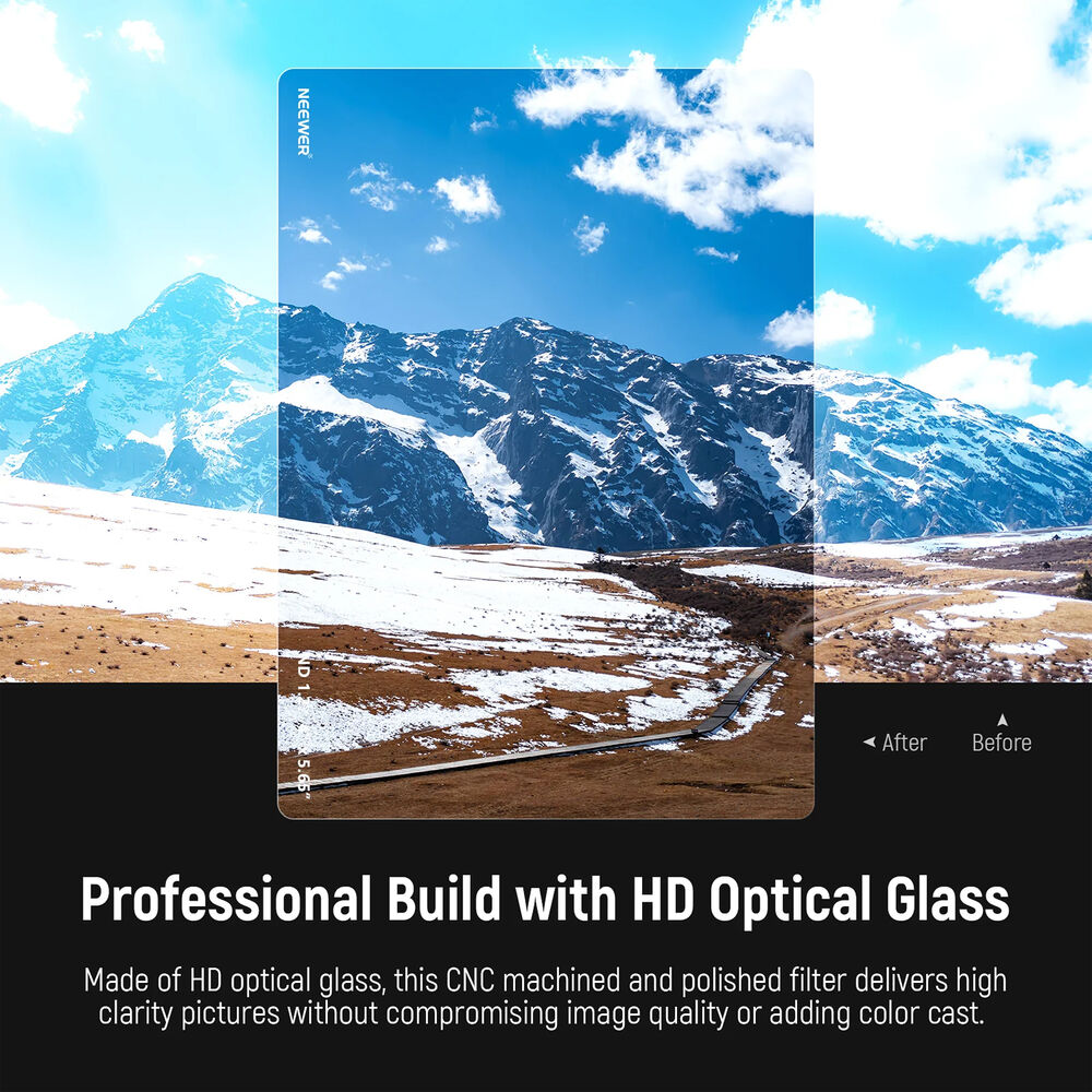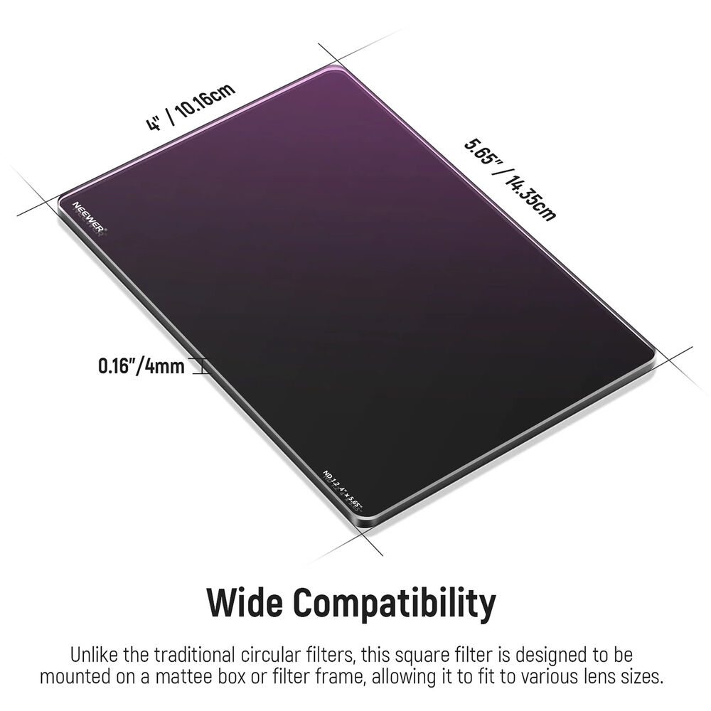 This 4 x 5.65" ND1.2 Filter from Neewer adds neutral density across an entire image are for finer exposure control. Increasing neutral density offers more flexibility in available shutter speeds or aperture settings for both still and video applications. Using a longer shutter speed makes it possible to increase blur to convey a sense of movement. Increased density also makes it possible to shoot using wider lens apertures, helping to isolate a subject from the background and increasing bokeh.