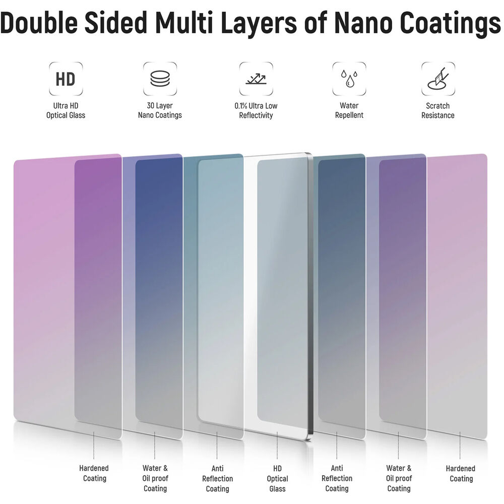 This filter is made of optical glass for sharpness and features 30 layers of multicoating for optical light and color transmission. It also has a waterproof and scratch-resistant coating for use in harsh locations, and for easy cleaning.