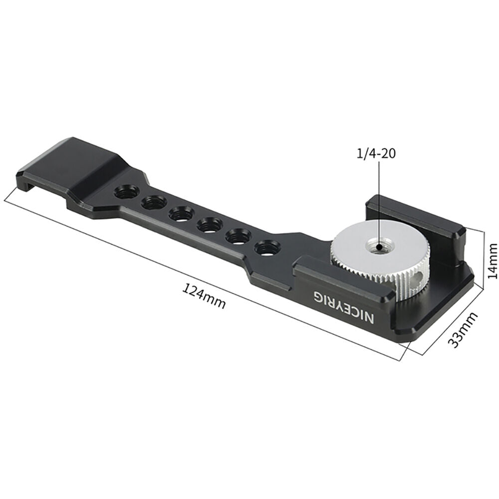 This Cold Shoe Mount Bracket with Arca-Type Dovetail from Nicerig is an easy to extend and compact accessory bracket compatible with most mirrorless, compact video, DSLR, and action cameras. It attaches to the cameras base via a knurled 1/4"-20 screw and features a cold shoe for mounting a microphone, LED light, or other accessory to the left of the camera. The cold shoe features and anti-off design that does not allow the accessory shoe to pass fully through it, preventing accessories from accidentally falling off. This precision CNC-machined bracket incorporates Arca-type dovetail mounts and features six 1/4"-20 accessory mounts, allowing additional rig customization. The black anodized finish resists corrosion, and the camera platform's rubberized base prevents camera rotation and marring the camera's finish.