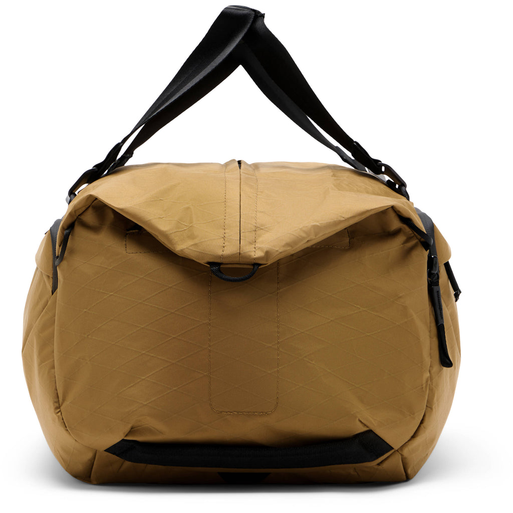 The 35L, coyote Travel Duffel from Peak Design has a 100% recycled 600D nylon canvas top and a waterproof 900D bottom. The oversized #10 weatherproof zipper allows you to open the bag wide for easy access to your equipment. Designed to hold three optional packing cubes, it has two interior and four exterior pockets for accessories. The removable, padded hand straps close with magnetic clasps and can be reconfigured to wear the duffel like a backpack. The shoulder strap can be used to wear the bag cross-body style.