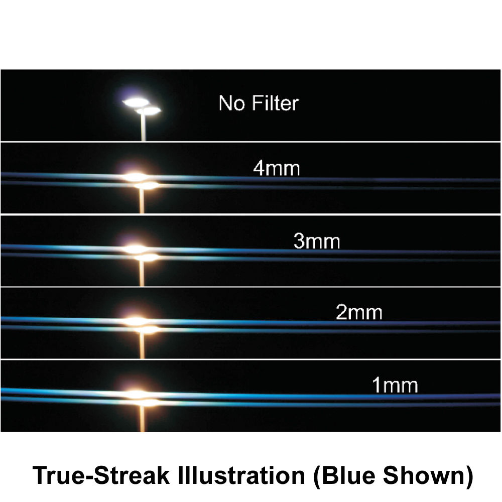 The line types within this filter's glass are placed 2mm apart from each other. True-Streak Filters with spaces of 4mm, 3mm, or 1mm between their lines are also available where this filter type's effect becomes progressively stronger as the spacing between those lines is decreased.