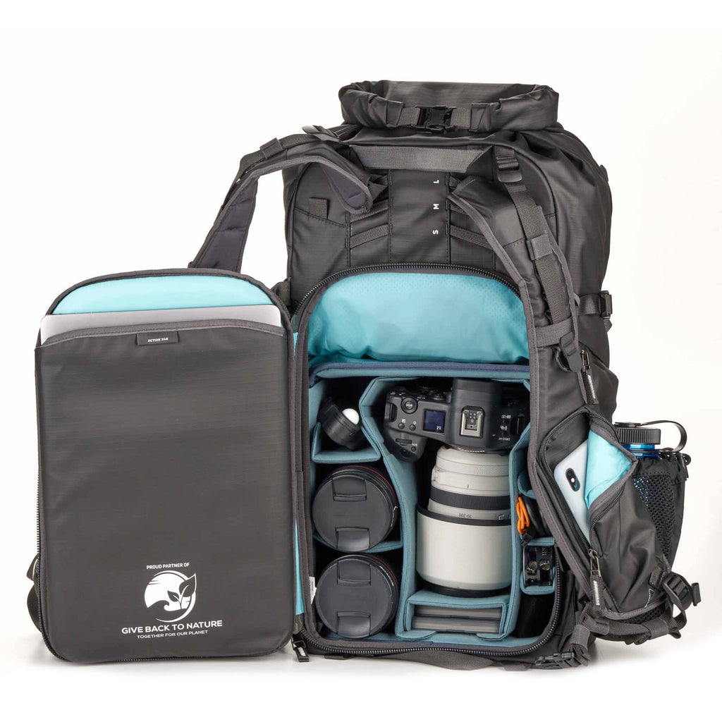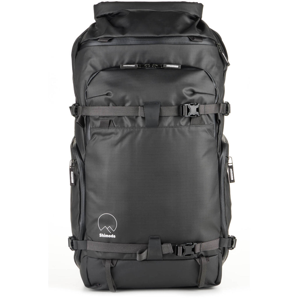 The black Action X40 V2 Backpack from Shimoda Designs has a 40L capacity and offers photographers a compact, durable carry solution that allows fast access to gear. Two padded sleeves hold and protect laptops or tablets up to 16". The roll top access allows you to expand or compress the volume depending on your needs. There are multiple attachment straps including TPU compression straps for increased durability when attaching bulky items such as skis. The removable helmet holder secures a bike or ski helmet to the exterior of your pack.