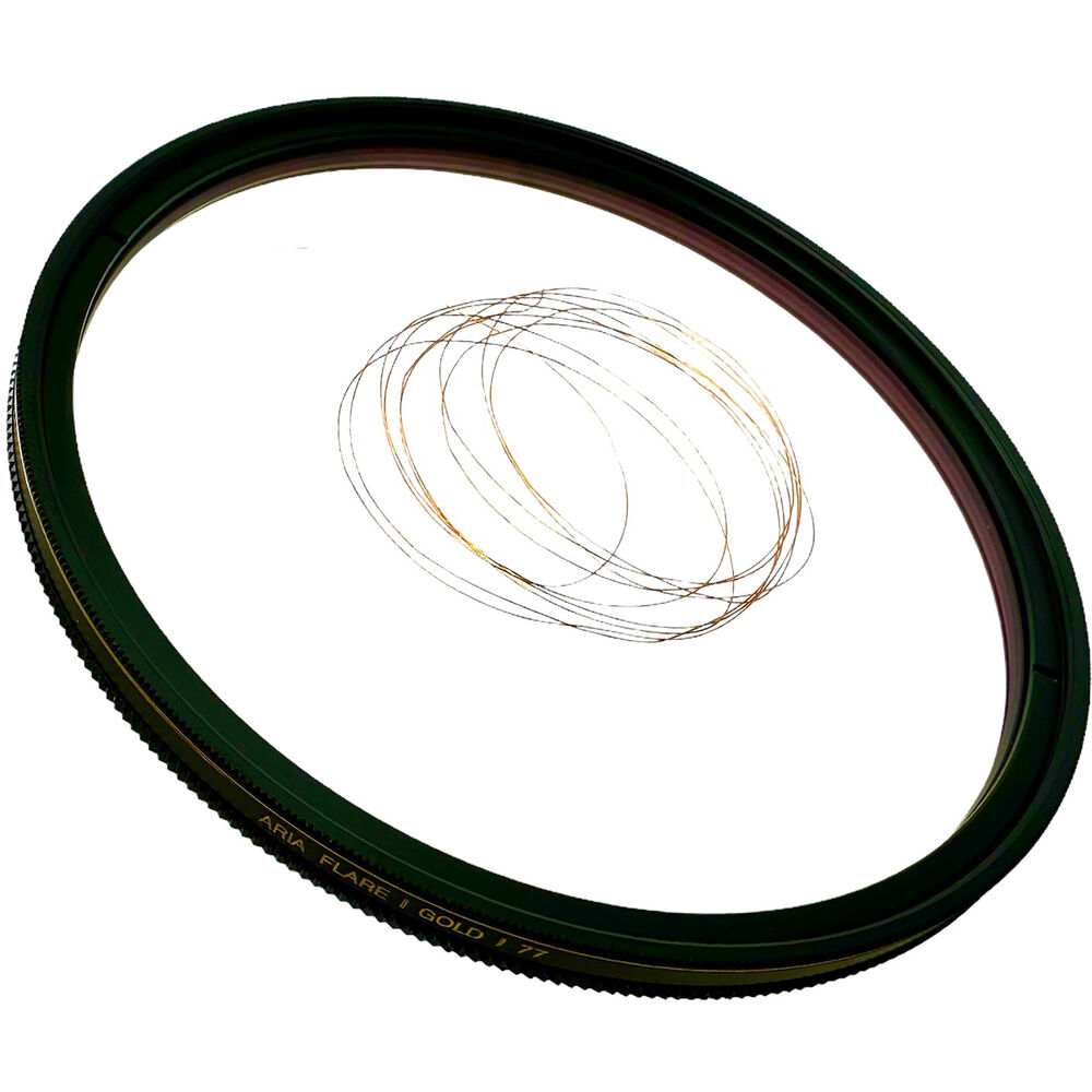The 77mm Aria Gold Flare Filter from Simmod is a special-effect filter crafted with fine metallic thread embedded between two panes of HD Schott glass with 14-layer nano coating and a brass frame. Designed to refract light, the metallic threads within this filter can interact with a hard light source, resulting in an array of gold light swirls and shafts.