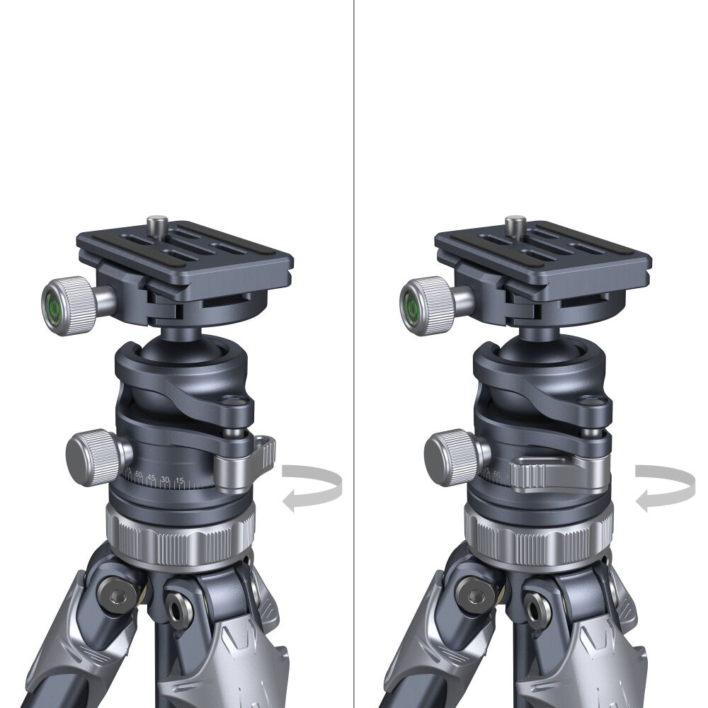 The included ball head has a locking lever for making fast adjustments plus an independent locking knob of its panoramic base. It has an Arca-type quick release clamp with classic locking knob and includes a quick release plate. The ball head also has two bubble levels for precise positioning.