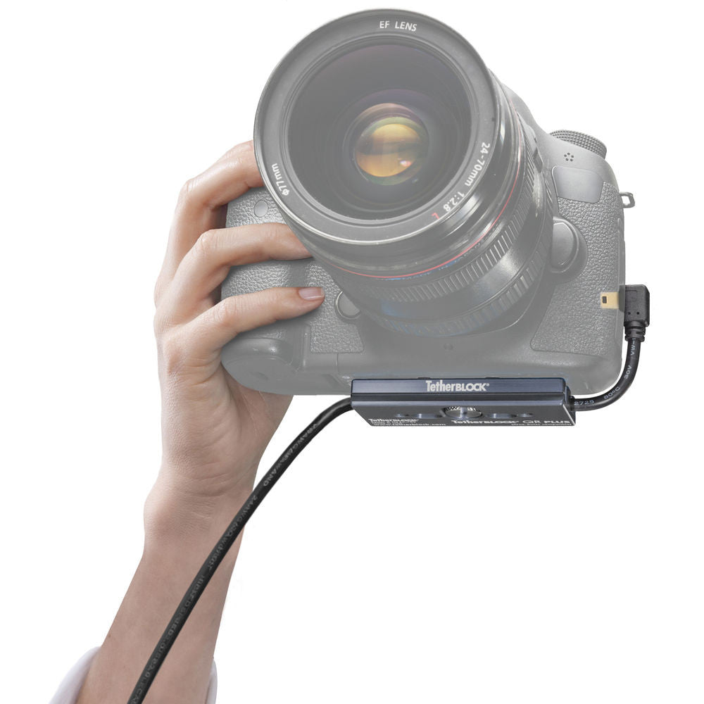 The thunder gray TetherBLOCK QR Plus Quick Release Plate is designed to adapt a camera to an Arca-type compatible quick release clamp and prevent damage to the camera's data port while tethered to a computer or hard drive.