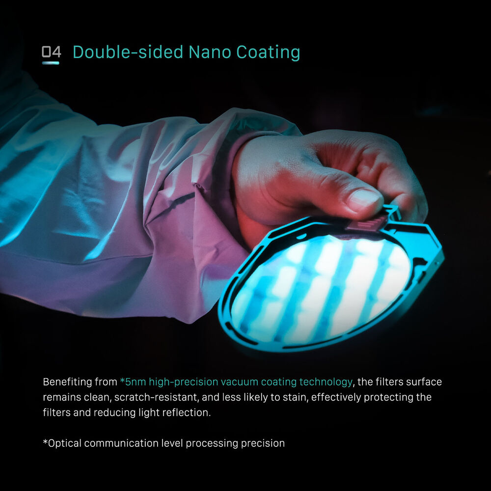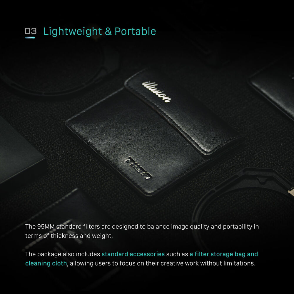 The 1/2-grade Illusion Black Mist Filter from Tilta is a nano-coated diffusion filter in the popular 4 x 5.65" size. By reducing contrast and producing a subtle glow around light sources, this filter creates a soft visual atmosphere but still retains more sharpness, detail, and contrast in the shadows than possible with a standard mist filter. This filter is ideal for users looking for a classic diffused look that isn't overly distracting. The filter is made with premium water white glass and is crafted to prevent reflections and provide accurate color rendition.