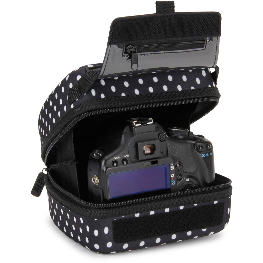The polka dot H Series Molded EVA Quick Access SLR Hard Shell Camera Case from USA GEAR combines style and durability with a lightweight design to keep your camera and lens safe and secure in just about any setting. This case is made from DuraNeoprene that will protect against scratches, dust, and low-impact bumps. It is form fitting while providing enough space for both your camera and lens while the soft egg crate foam interior gives cushioned protection.