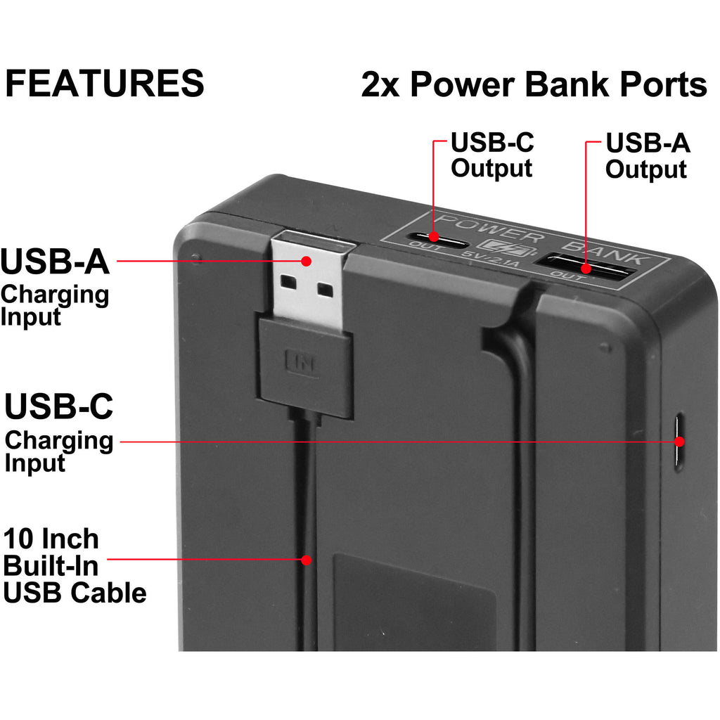 Simultaneously charge two batteries from USB with the VDL-44 Dual Bay LCD Charger with Power Bank from Vidpro. The Power Bank feature provides energy from mounted batteries and has dual USB-A and USB-C power output ports. The charger allows you to charge one or two lithium-ion camera batteries simultaneously. The backlit LCD display clearly shows the charging power status of each bay independently. A built-in USB charging cable and a USB-C input are included for versatile charging options. The device is compatible with the Pentax D-Li90.