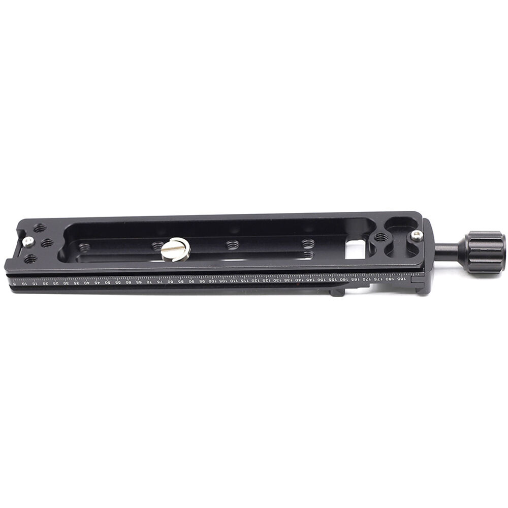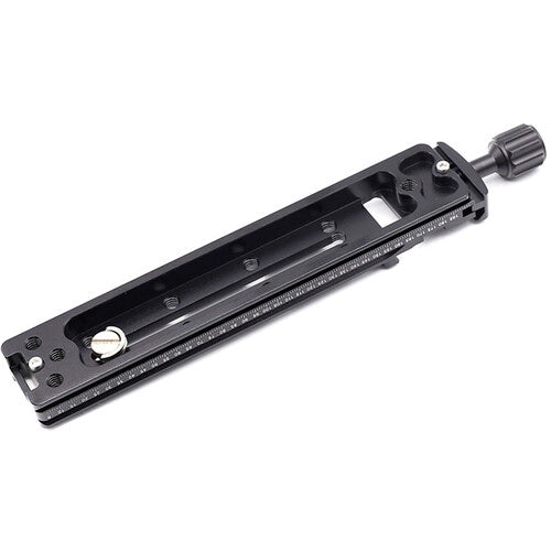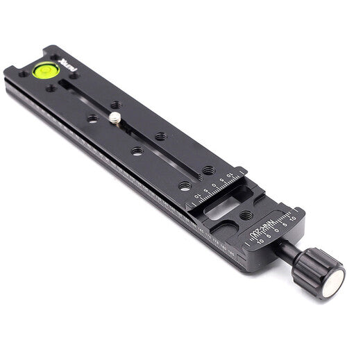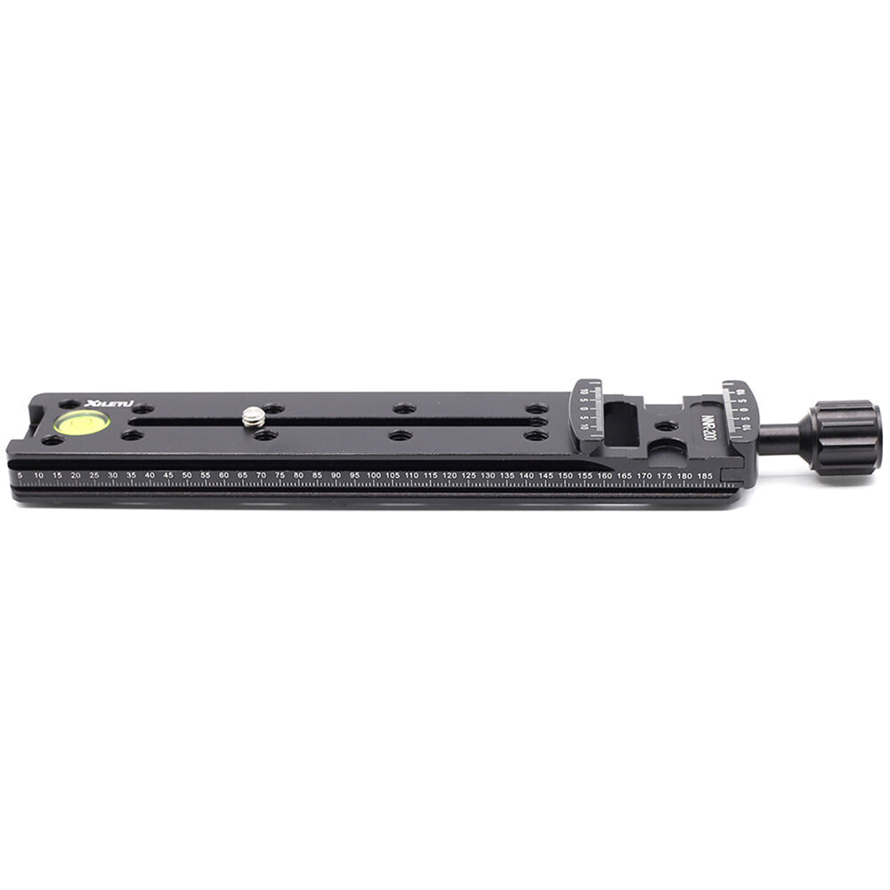 The NNR-200 Multifunction Long Arca-Type Plate with Quick Release Clamp from XILETU is a 8" rail that can expand a camera setup by adding an upper dovetail joint and 10x 1/4"-20 female mounts to mount accessories. It can be mounted on any tripod head or other rig with an Arca-type receiver for easy expansion, or to add a microphone, LED light, monitor or more. It features a bubble level for accurate positioning and has an integrated Arca-type quick release receiver with a locking knob. The long plate and the quick release clamp each feature numbered scales for precise and repeatable positioning.