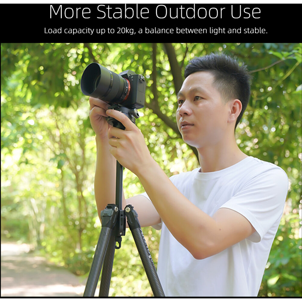 The X255SC Carbon Fiber Tripod from Xiletu is a lightweight and versatile tripod suitable for use with action cameras,360° video cameras, point & shoot cameras, compact DSLRs, and mirrorless camera systems. It has a load capacity of 44 lb and a maximum height of 61.4". The 5-section carbon fiber legs are made with twist-lock joints and rubber feet. The center column has a ballast hook and can be removed for low-perspective shooting. The low-profile ball head features an Arca-type quick release system with a quick release plate. It has a wraparound locking lever for quick adjustments.