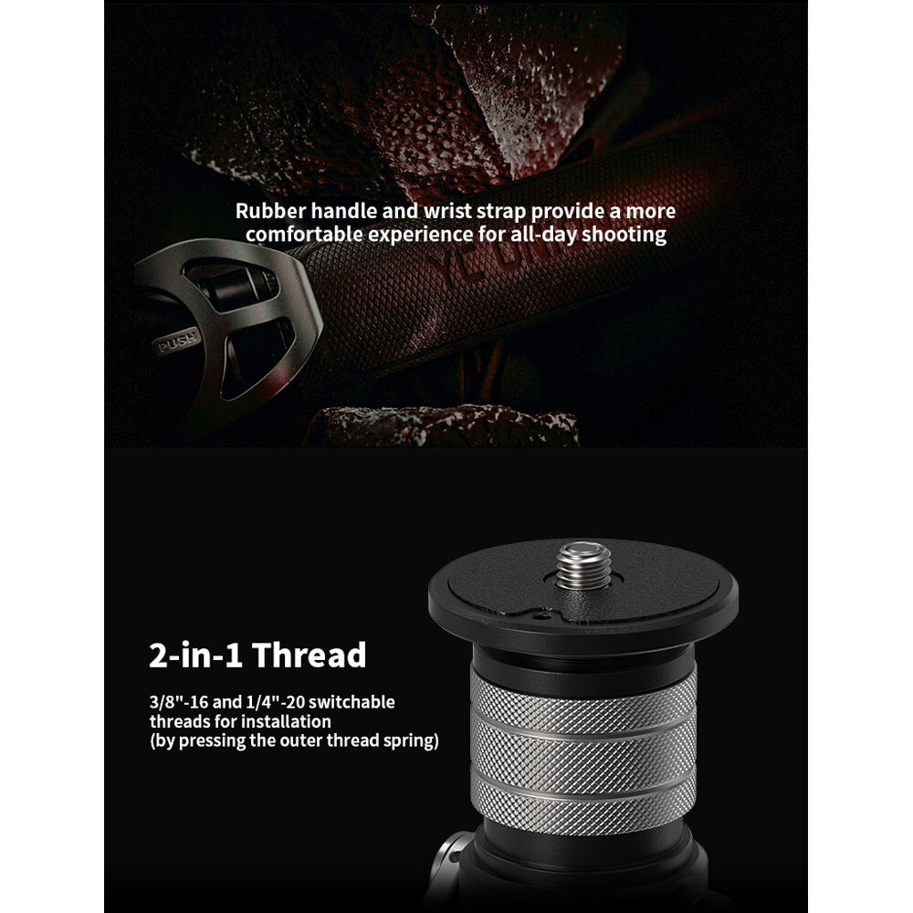 The Pineta SE 2.0 Aluminum Monopod with Pedal Base and FH60 Fluid Head from YC Onion is a monopod system with a single locking lever that allows all three leg segments and the pedal base to be extended, positioned, and locked in one action with the FEISO lever release. The monopod extends to a maximum height of 60.2" with a load capacity of 13.2 lb, and folds to a compact 29.8" for easy storage or travel. A 2-in-1 screw allows you to switch between a 1/4"-20 and 3/8"-16 mounting screw for compatibility with a wide variety of equipment.