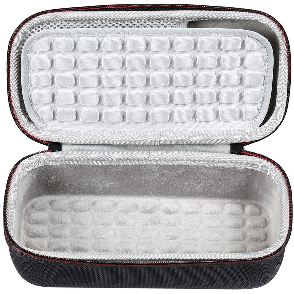The black Travel Carry Case for Bose SoundLink Flex Portable Bluetooth Speaker from Sahara Case is a slim, formfitting case designed to protect the speaker from shocks, splashes, scratches, and similar damage likely to occur in transit. It is constructed from foam rubber (EVA) and covered in nylon for extra protection and durability. A dual-zipper opening provides easy access to your speaker. On the lid, behind the padded layer protecting the speaker, is a pocket for charging cables and small accessories. A hand strap offers a firm, secure hold.